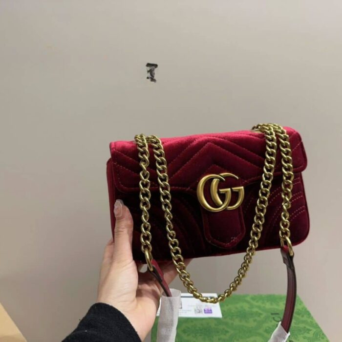 GUCCI SMALL GG MARMONT CAMERA BAG VELVET WINE RED 23CM