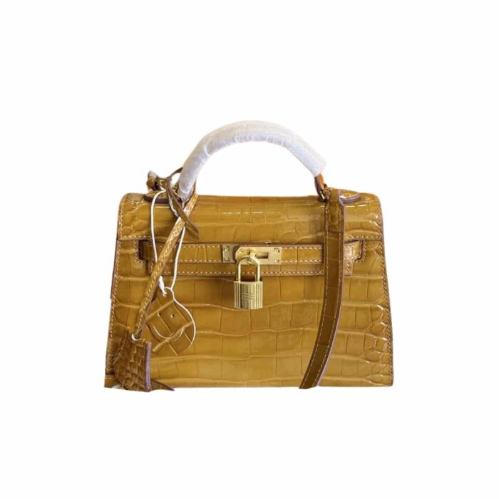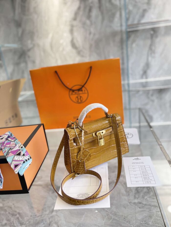 HERMES MINI KELLY CROCODILE GOLD TONED HARDWARE BLACK 19CM