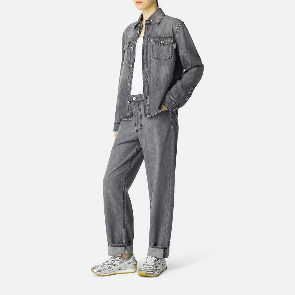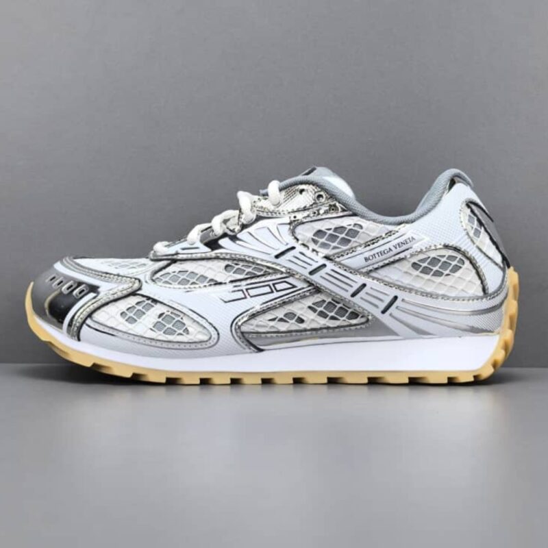 The Bottega Veneta Orbit Sneaker in silver and white blends retro running aesthetics with a modern technical mesh and metallic leather construction. Its ergonomic silhouette features a lightweight design for all-day comfort, finished with a durable rubber outsole for superior traction. This stylish performance shoe captures a contemporary athletic look, making it a versatile statement piece for a luxury urban wardrobe.