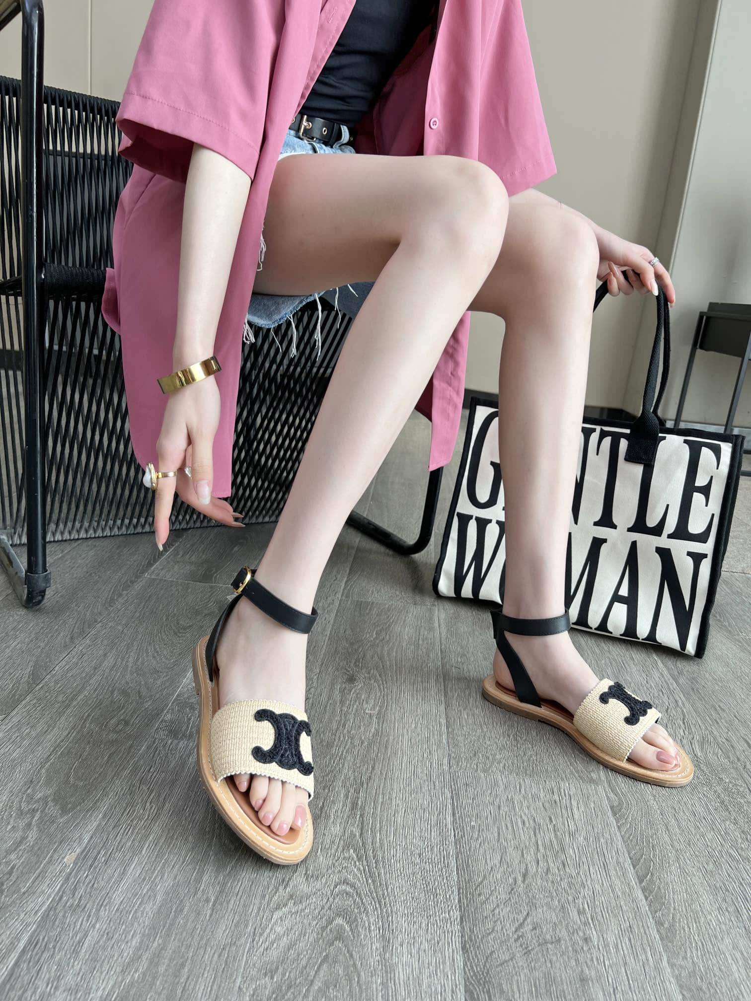 CELINE LYMPIA FLAT STRAP SANDAL IN RAFFIA CALFSKIN BEIGE BLACK 352402248C 02BL