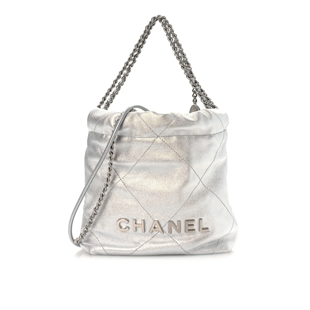 The Chanel 22 Mini Handbag Shiny And Gold Tone Metal Silver is a luminous and modern statement piece that reimagines the House’s signature aesthetic with a bold, metallic finish. This drawstring silhouette is meticulously crafted from supple quilted material with a high-shine silver effect, accented by a signature metal chain strap and a decorative CC logo charm. Its compact yet functional interior makes it a sophisticated accessory for the fashion-forward individual.