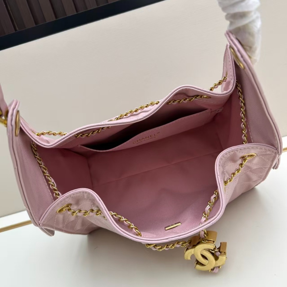 This iconic Chanel bag is a timeless piece of luxury, designed with quilted leather and a signature gold-tone chain strap. Featuring a stylish drawstring closure, it offers a perfect balance of elegance and functionality. Ideal for both day-to-night wear, this bag adds a chic, refined touch to any outfit. Enhance your collection with this classic piece that blends beauty, craftsmanship, and practicality.