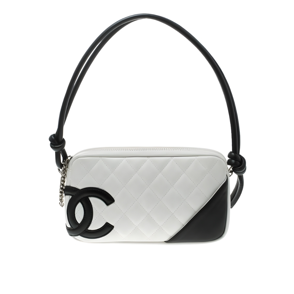 The Chanel Cambon Pochette in white quilted leather is a nostalgic masterpiece from the iconic Cambon Ligne. Featuring a striking black leather interlocking CC logo offset to the side and a contrasting black interior, this piece captures the bold, graphic aesthetic of the early 2000s. Its slim profile and knotted leather shoulder strap make it an effortlessly chic accessory for both day and night.