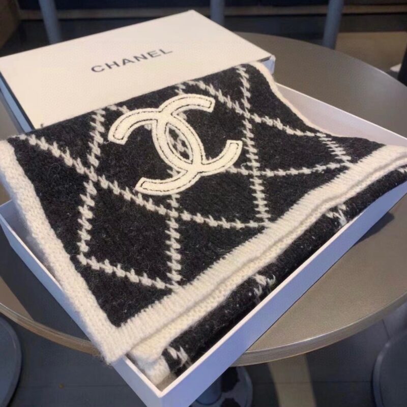 Chanel Cashmere Silk Quilted CC Scarf Black White 195Cm