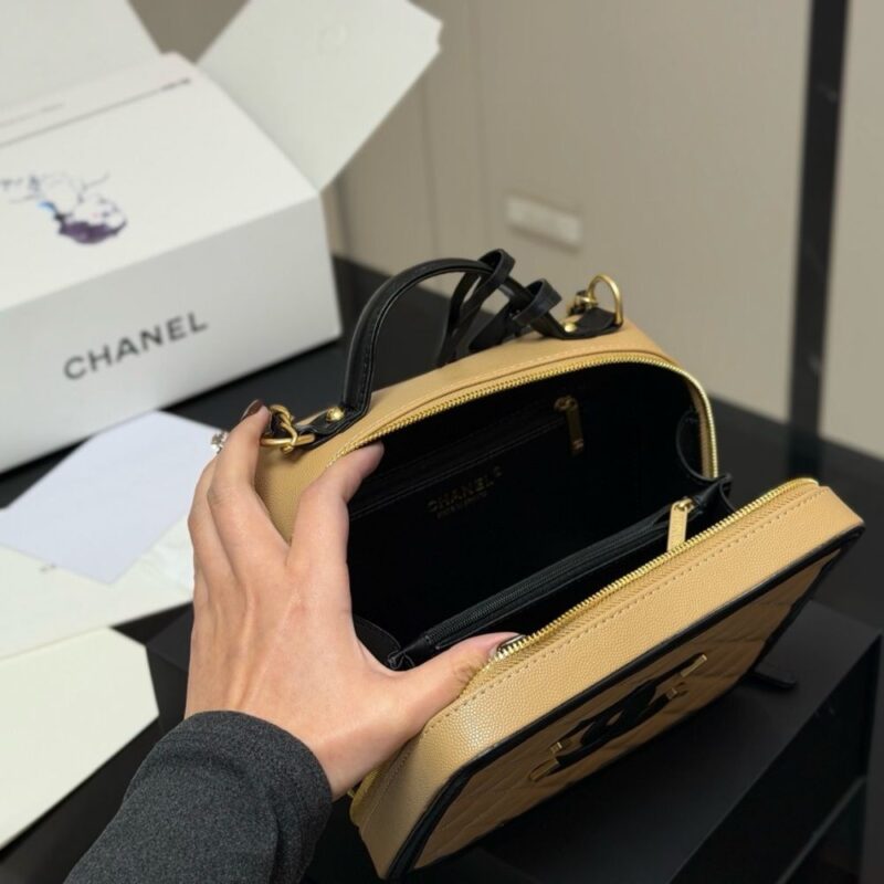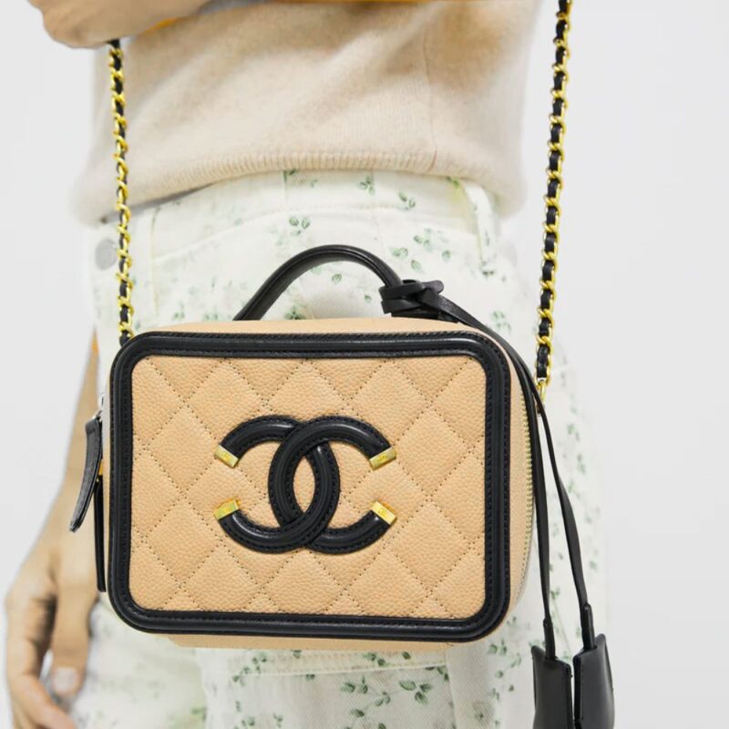 This Chanel Medium CC Filigree Vanity Case is in beige and black leather with antique gold hardware, featuring signature diamond quilting, CC stitched logo with gold accents on front of bag, dual zip around closure, a leather top handle, and a chainlink and leather shoulder strap. This bag is spacious enough for all of your travel necessities with the timeless quality and style only from Chanel.