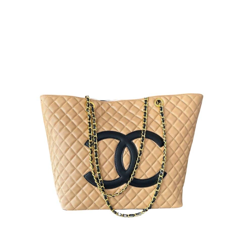 Chanel Cc Shopping Bag With Chain Leather / Beige 32cm