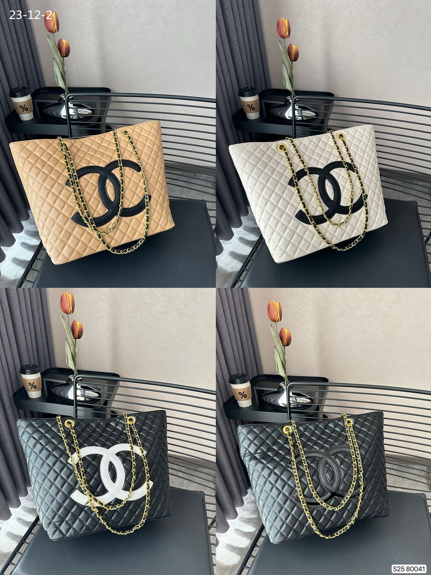 CHANEL CC SHOPPING BAG WITH CHAIN LEATHER BEIGE 32CM