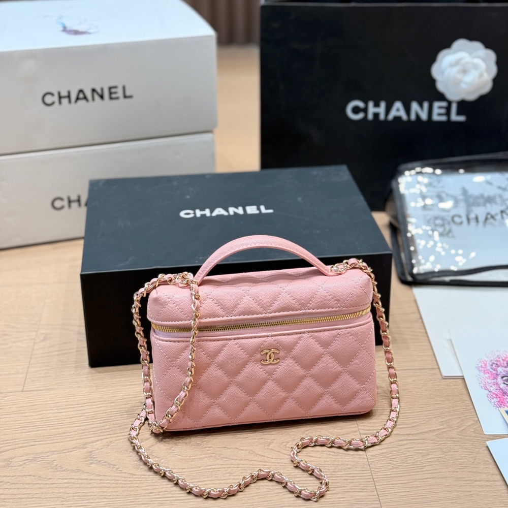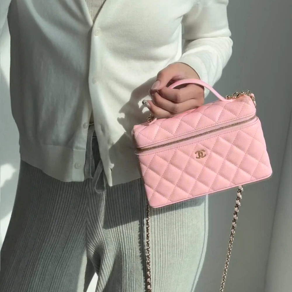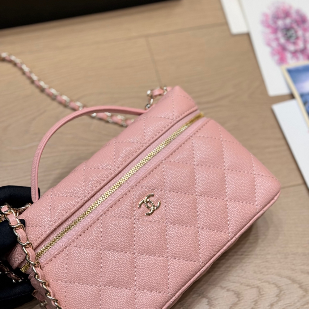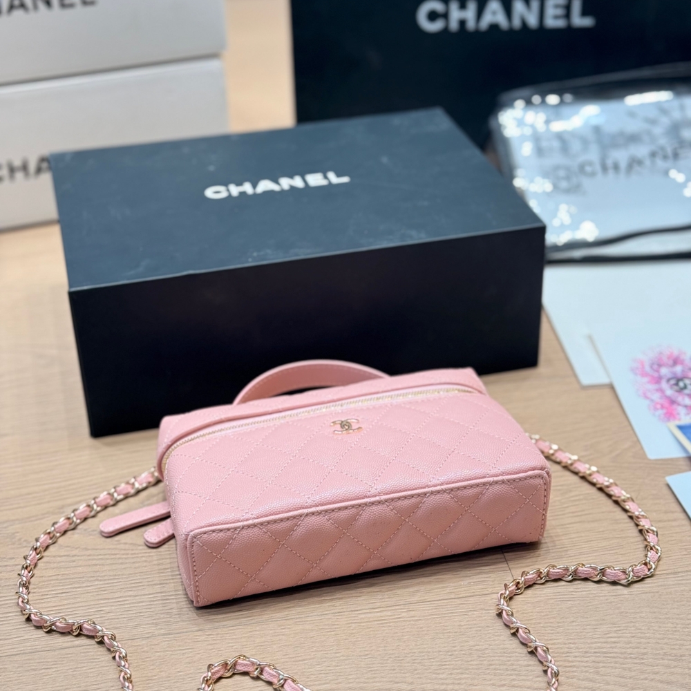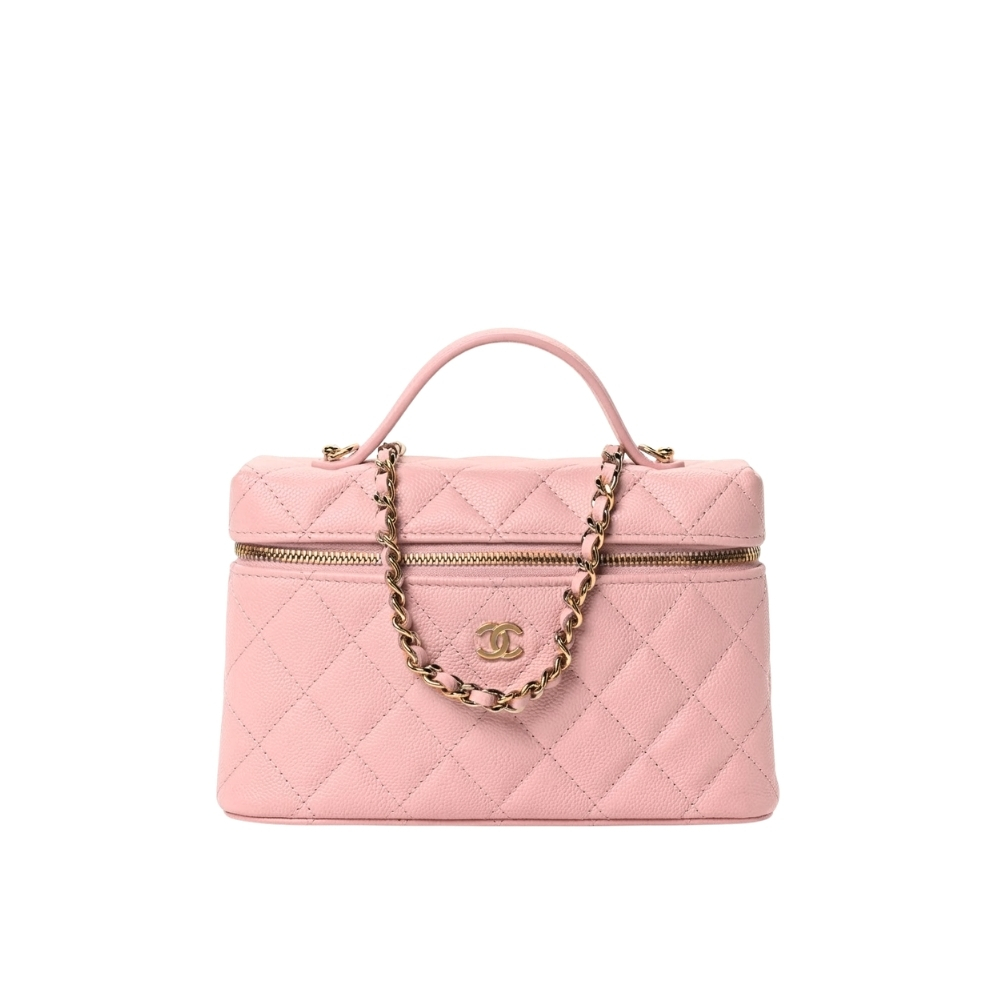 The Chanel Classic Vanity With Chain Gold Hardware Pink features a structured vanity silhouette in pink quilted leather, accented by gleaming gold-tone hardware and a functional top handle, making it a chic and compact choice for modern luxury.