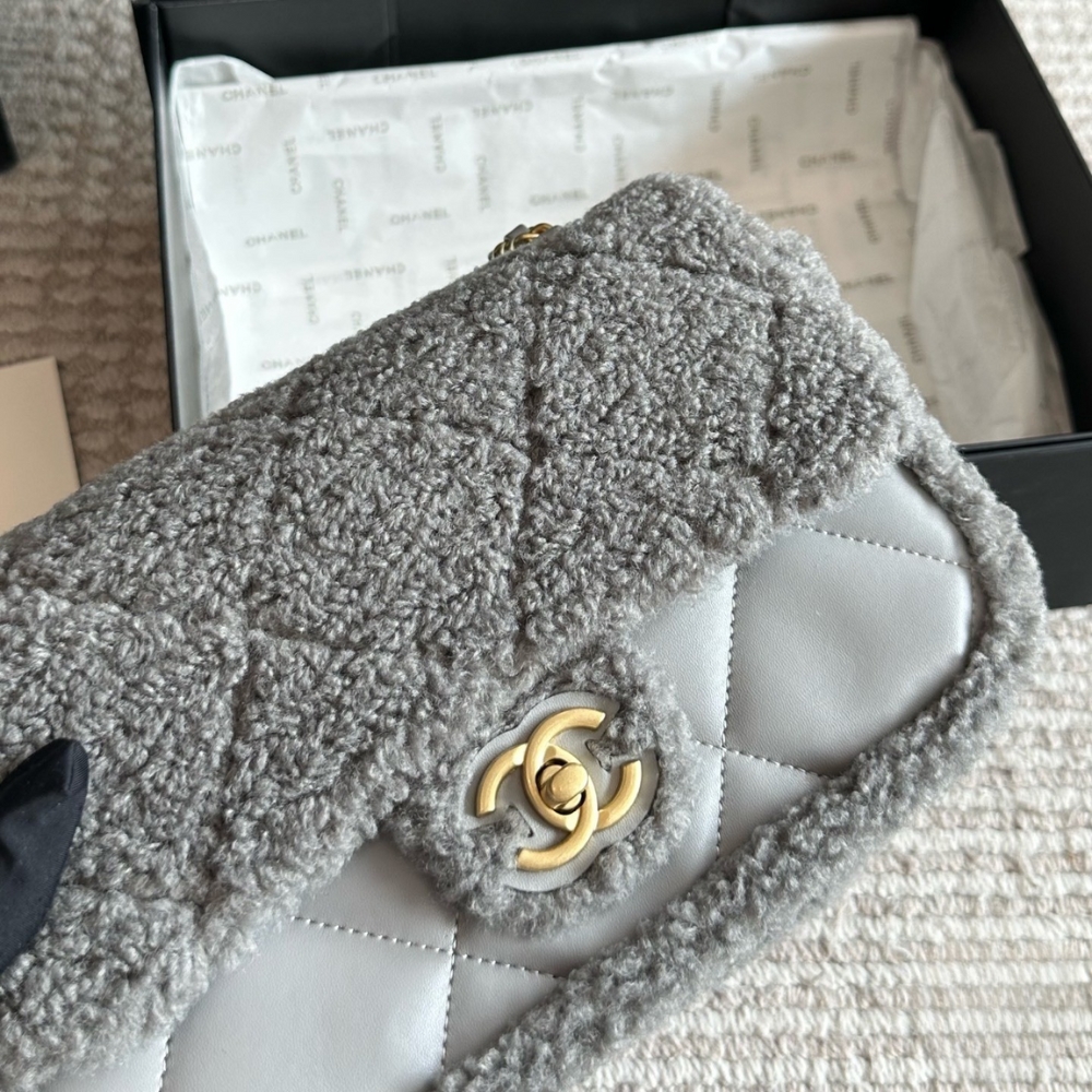 Chanel Flap Bag Teddy Shearling Gold Tone Metal Grey / 25 cm / 9.8 inches