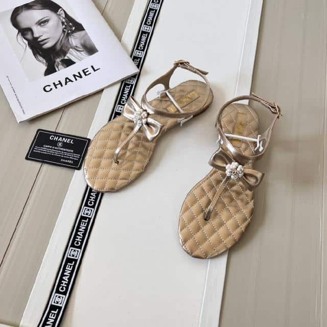 CHANEL GOLD QUILTED LEATHER WITH WHITE CAMELLIA CC LOGO BOW THONG SANDALS