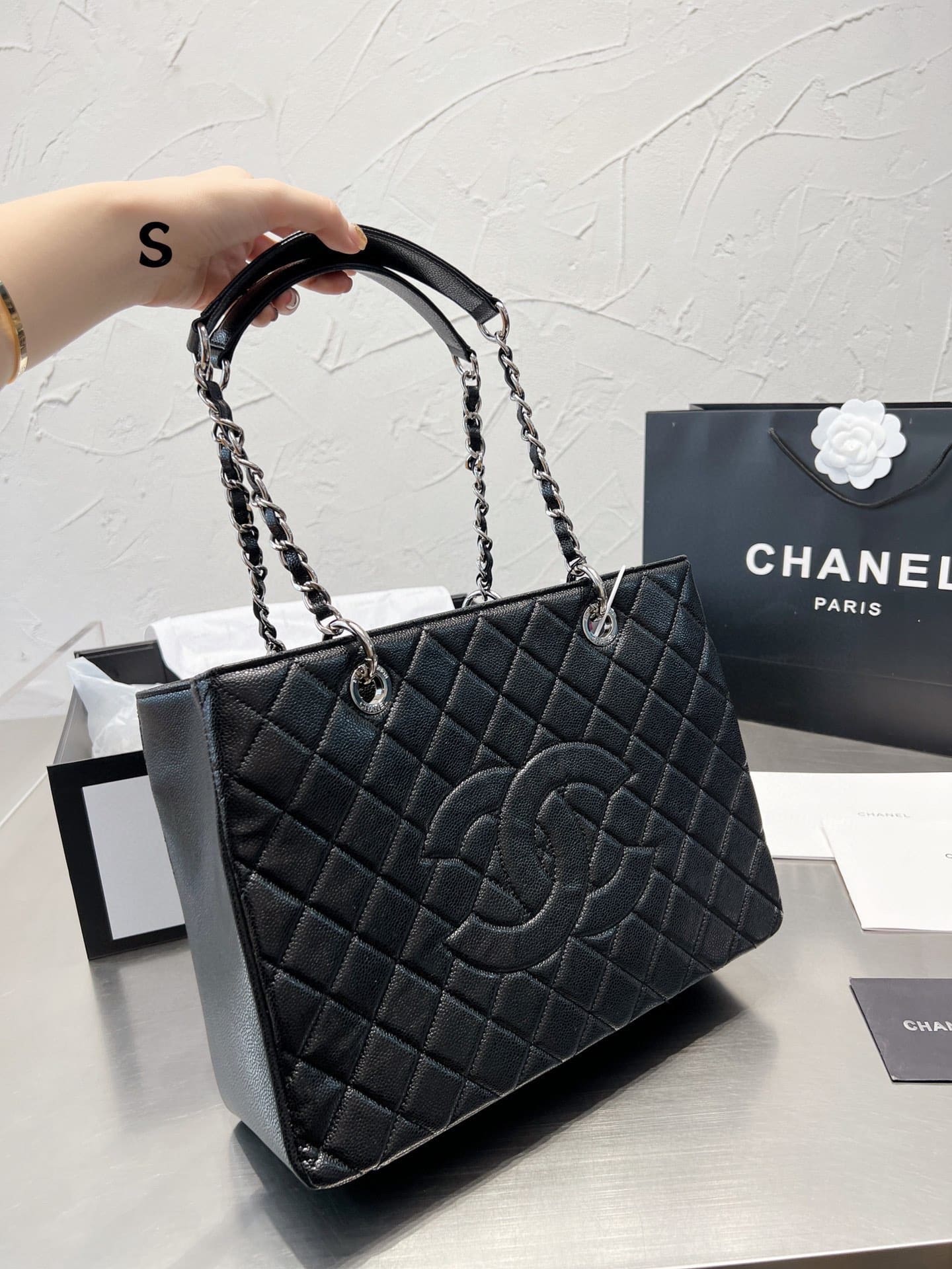 Chanel Grand Shopping Tote Bag / Black Caviar Silver Tone Chain 34Cm