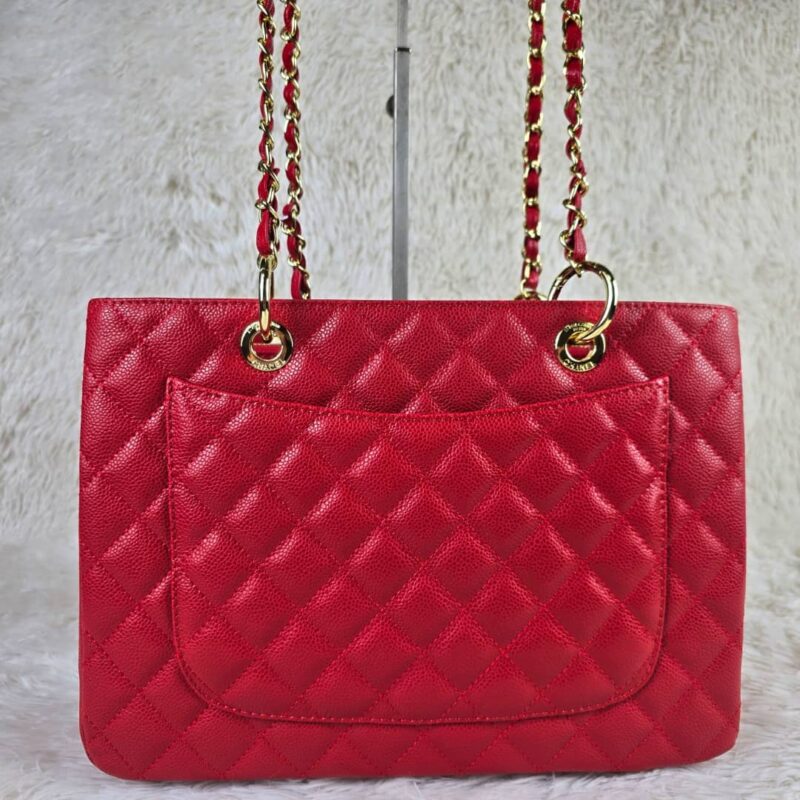 The Chanel Grand Shopping Tote in radiant red is a masterpiece of functional luxury, crafted from durable quilted leather and accented with an iconic embossed CC logo. Featuring sophisticated gold-tone hardware. This tote offers a spacious, organized interior perfect for the modern woman’s daily essentials. Its bold color palette and timeless structured silhouette make it an essential statement piece that transitions effortlessly from professional meetings to elegant evening outings.
