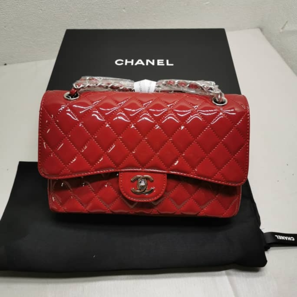 CHANEL MEDIUM CLASSIC DOUBLE FLAP BAG PATENT LEATHER RED 26CM