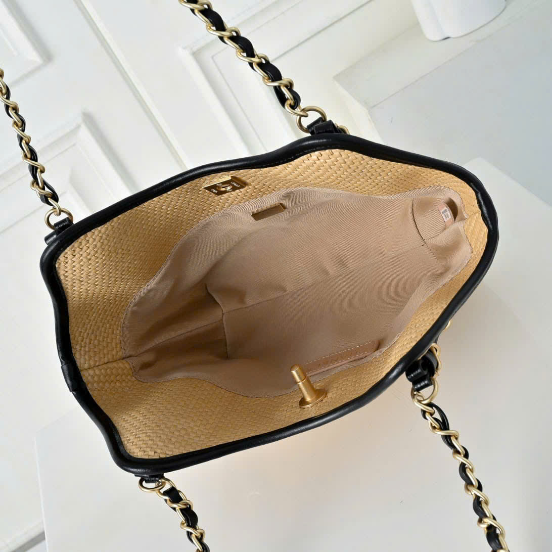The Chanel Medium Shopping Bag in braided raffia features a natural beige texture contrasted with sleek black leather trim and iconic gold-tone hardware, delivering a sophisticated yet relaxed aesthetic perfect for both coastal escapes and city strolls.