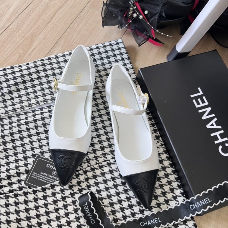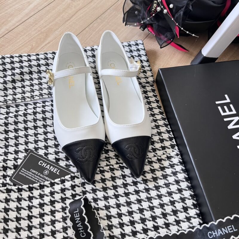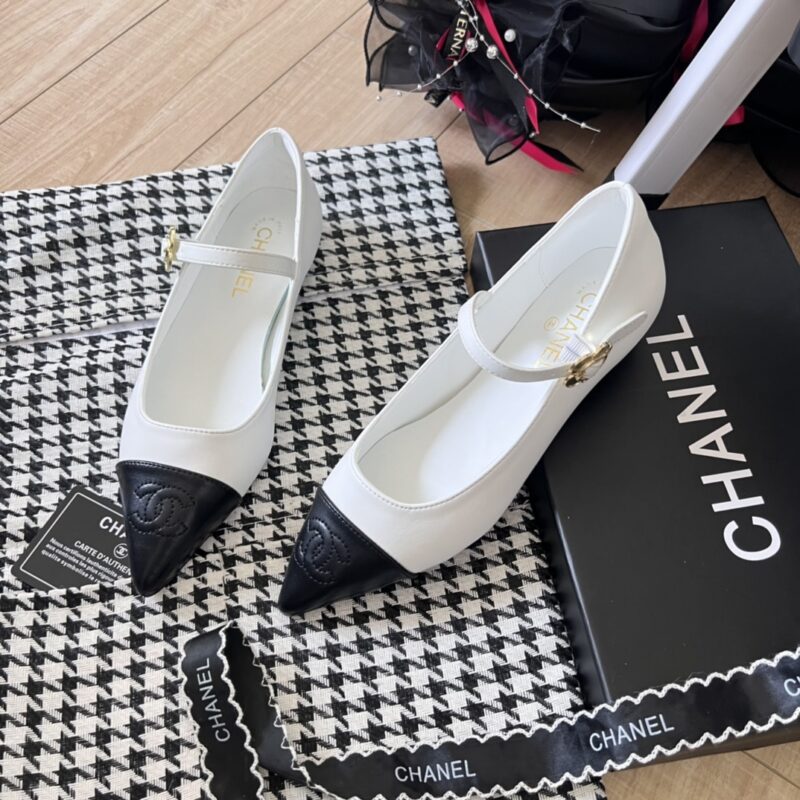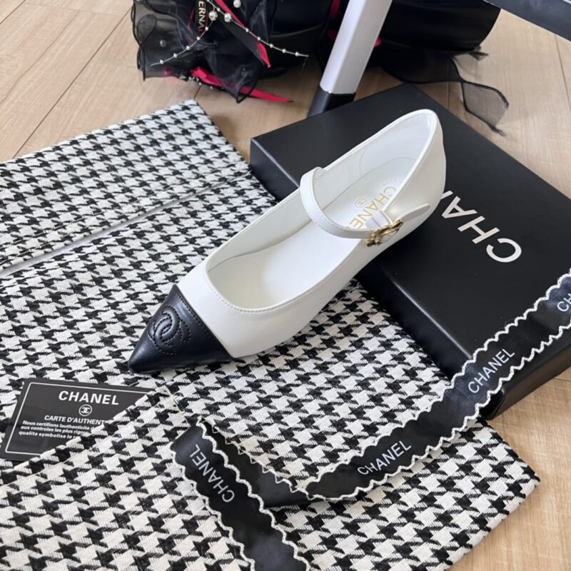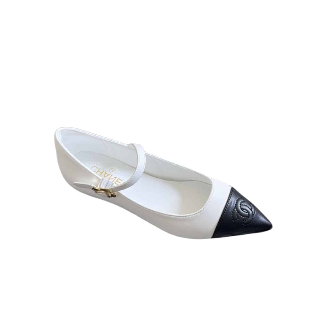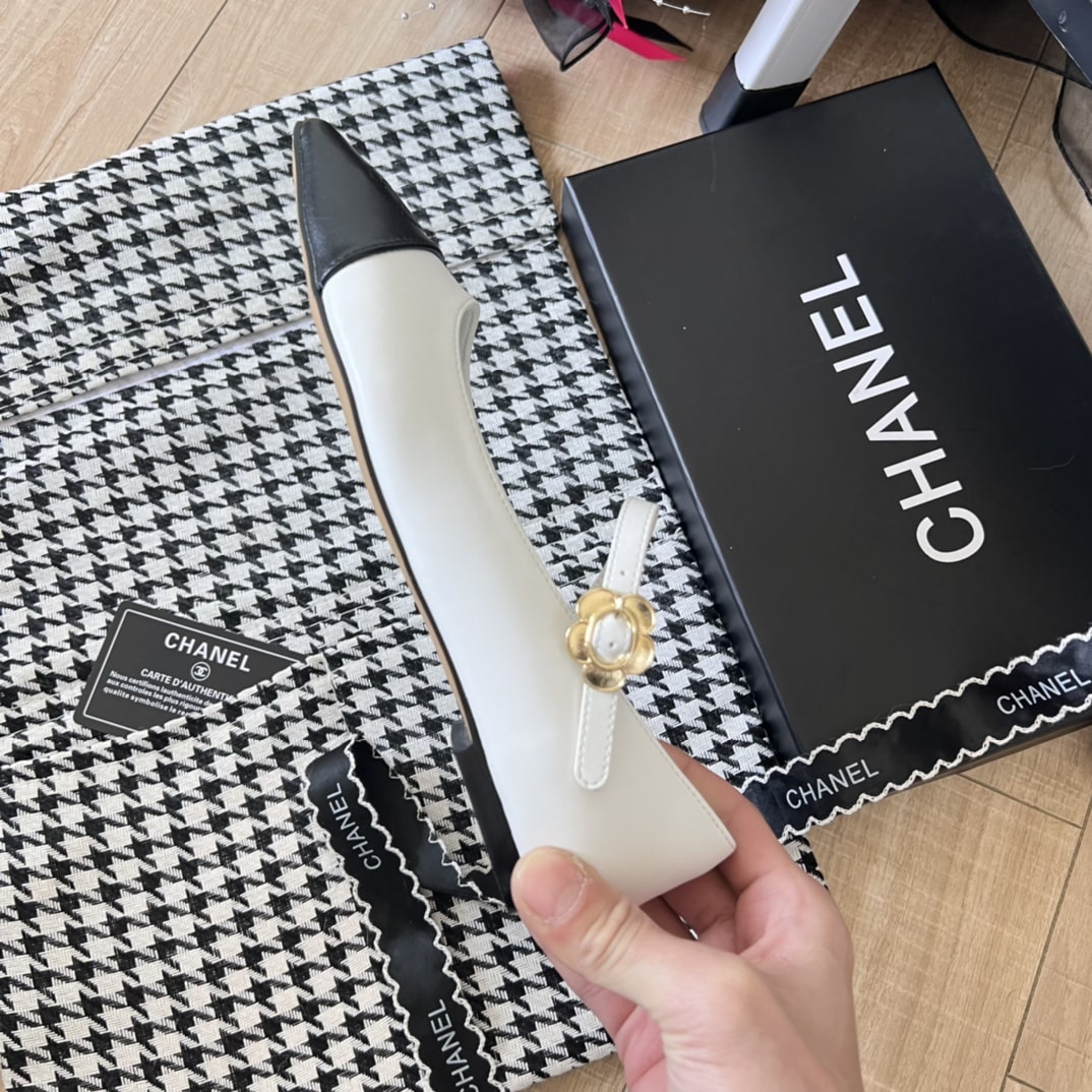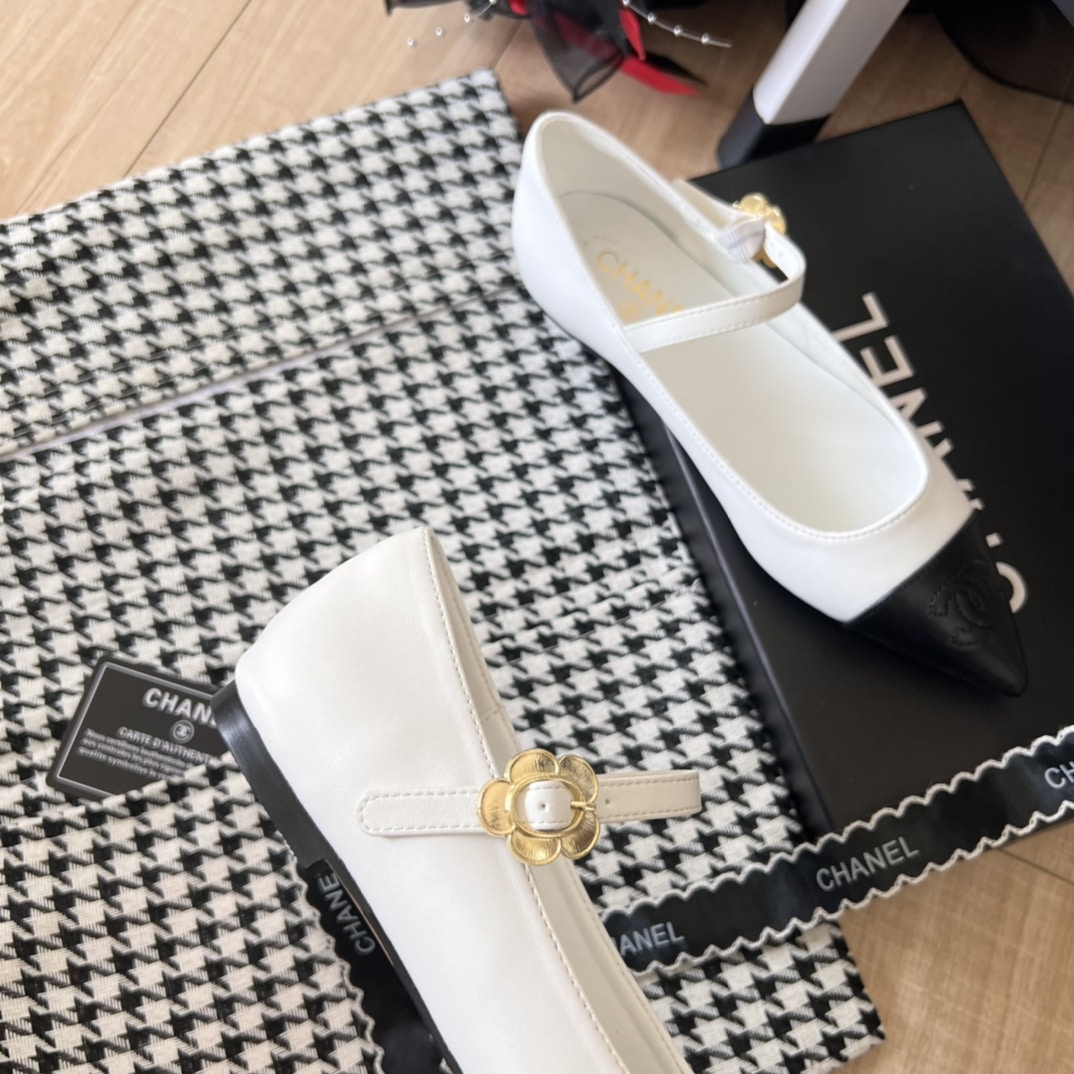 CHANEL POINTED TOE DOLL SHOES WITH GOLD FLOWER IN WHITE
