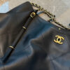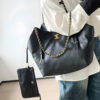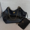 The Chanel Shopping Bag in black is a versatile luxury tote that balances sophisticated structure with a relaxed, modern silhouette. Expertly crafted from leather, this model is detailed with radiant gold-tone metal hardware, including the iconic interlocking CC logo and signature chain-link straps. With its generous 33cm width, the bag offers a spacious interior designed for daily functionality, often accompanied by a matching removable pouch for organized storage. This piece serves as a timeless staple, transitioning effortlessly from professional settings to elegant urban outings.