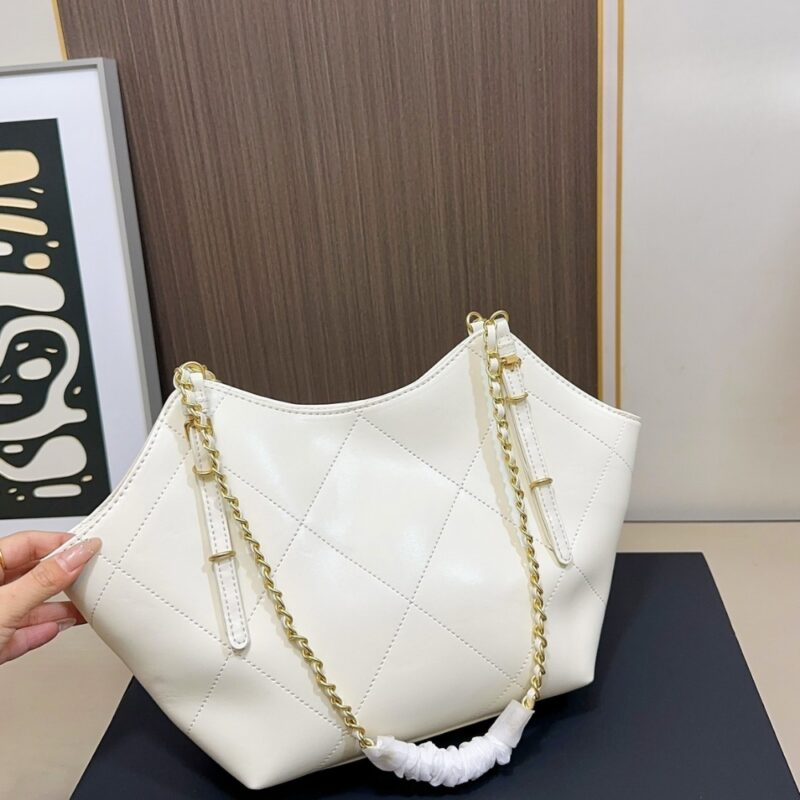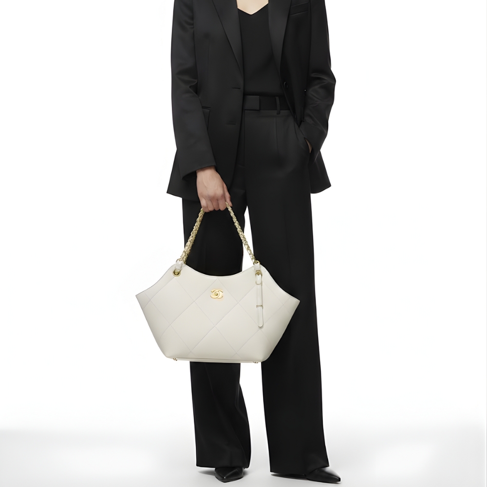 Chanel Shopping Bag / Gold tone metal / White / 8.3 x 7.9 inchess / Iconic interlocking CC / Application style / Bag for Women
