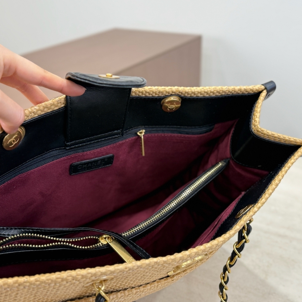 This Chanel tote bag features a natural woven raffia body accented with black leather trim and gold-tone chain straps. The large silhouette offers ample space while maintaining a refined and elegant look. Finished with the iconic CC logo, it blends effortless summer style with classic Chanel sophistication.