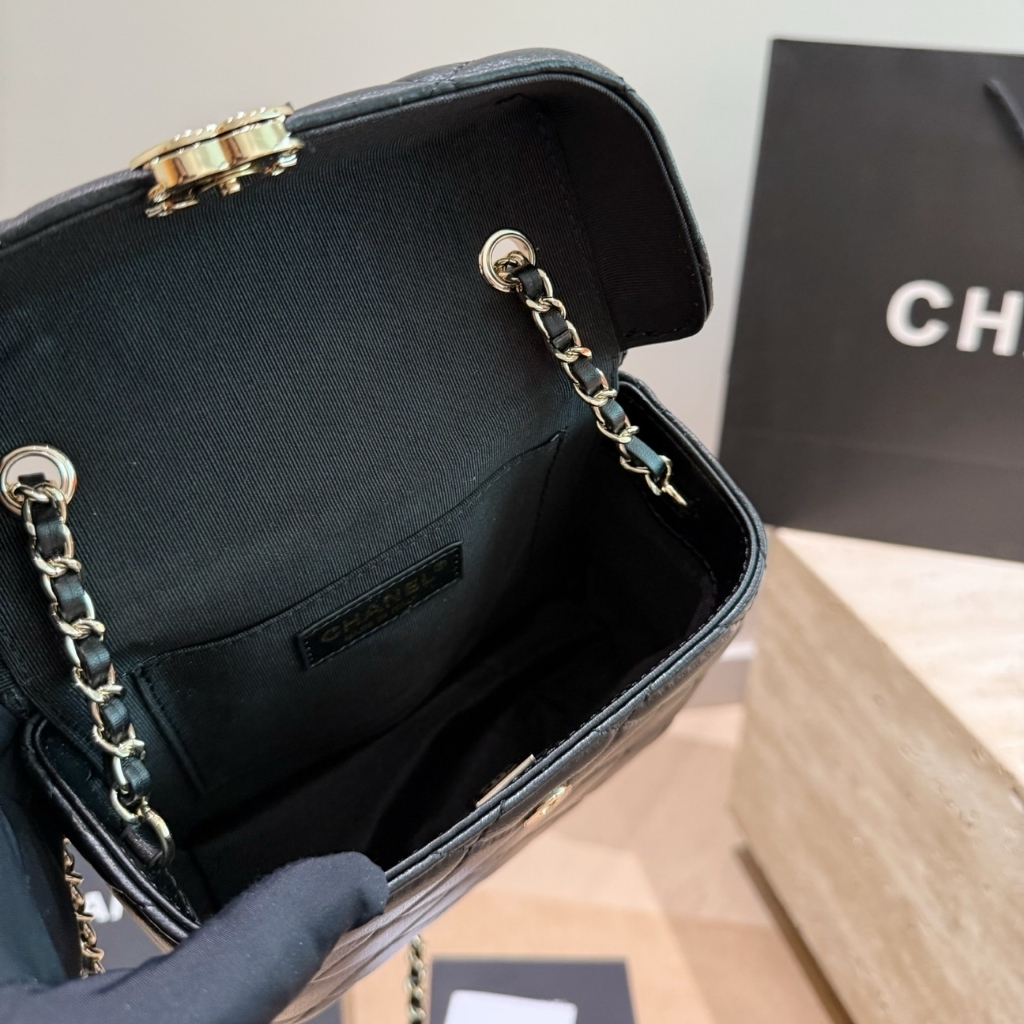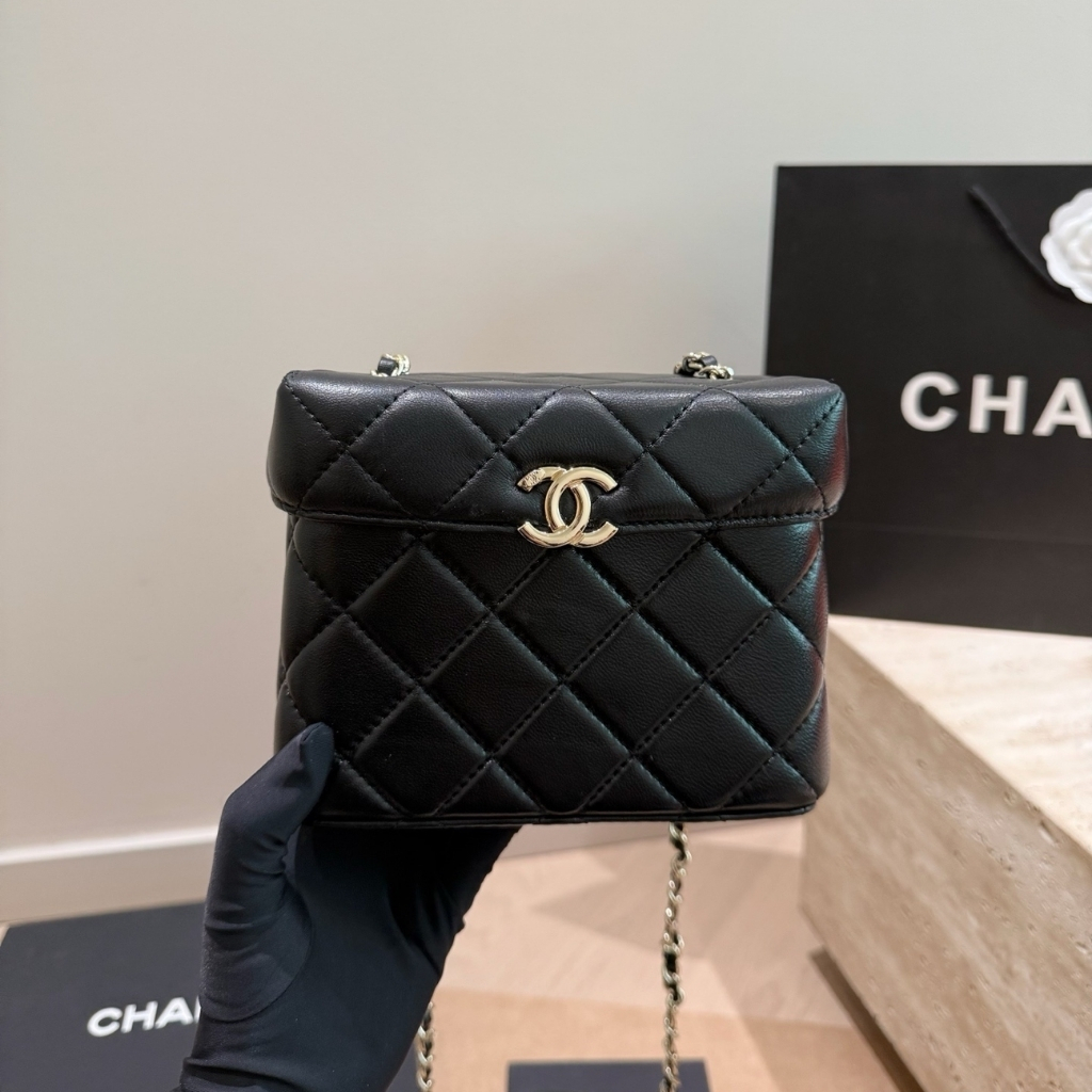 The features the signature diamond quilting and the iconic CC logo on the front, paired with a structured box silhouette for a refined look. The bag includes a leather-threaded chain strap for shoulder or crossbody wear. With its compact 16 cm size, this elegant piece is perfect for evenings, special events, or adding a sophisticated touch to any outfit.