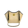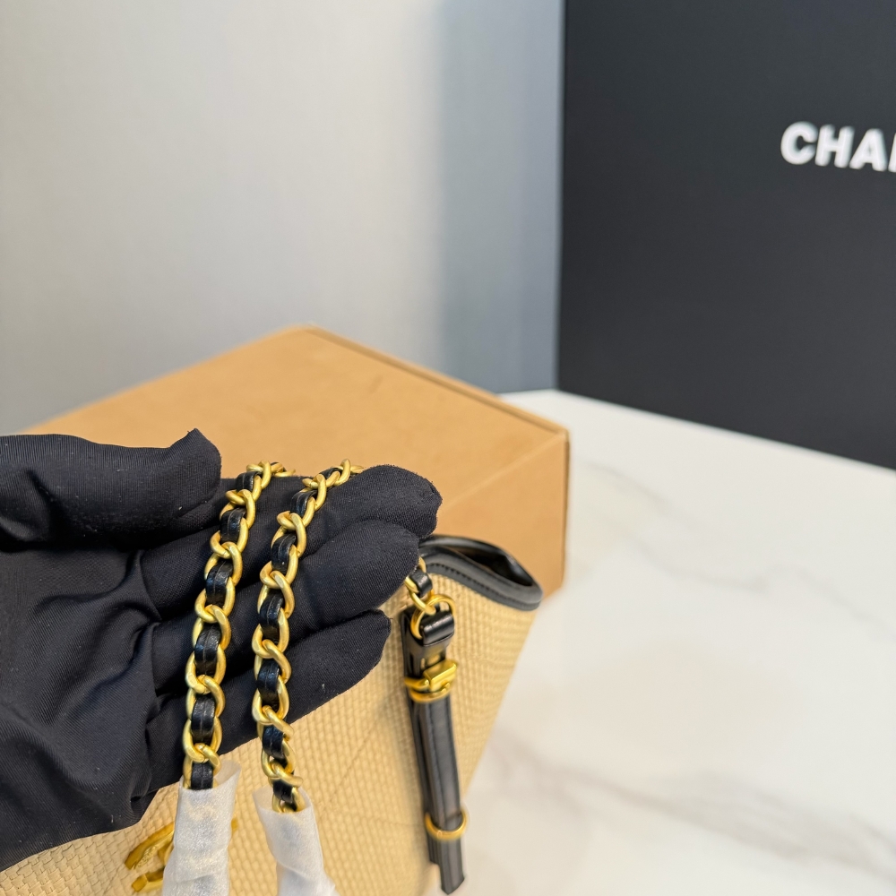 The Chanel Small Shopping Bag in Braided Raffia-Effect Canvas is a sophisticated and breezy accessory that embodies a timeless Mediterranean aesthetic. This model offers a refined alternative to leather, featuring a high-texture beige raffia-effect body accented with classic black leather trim.