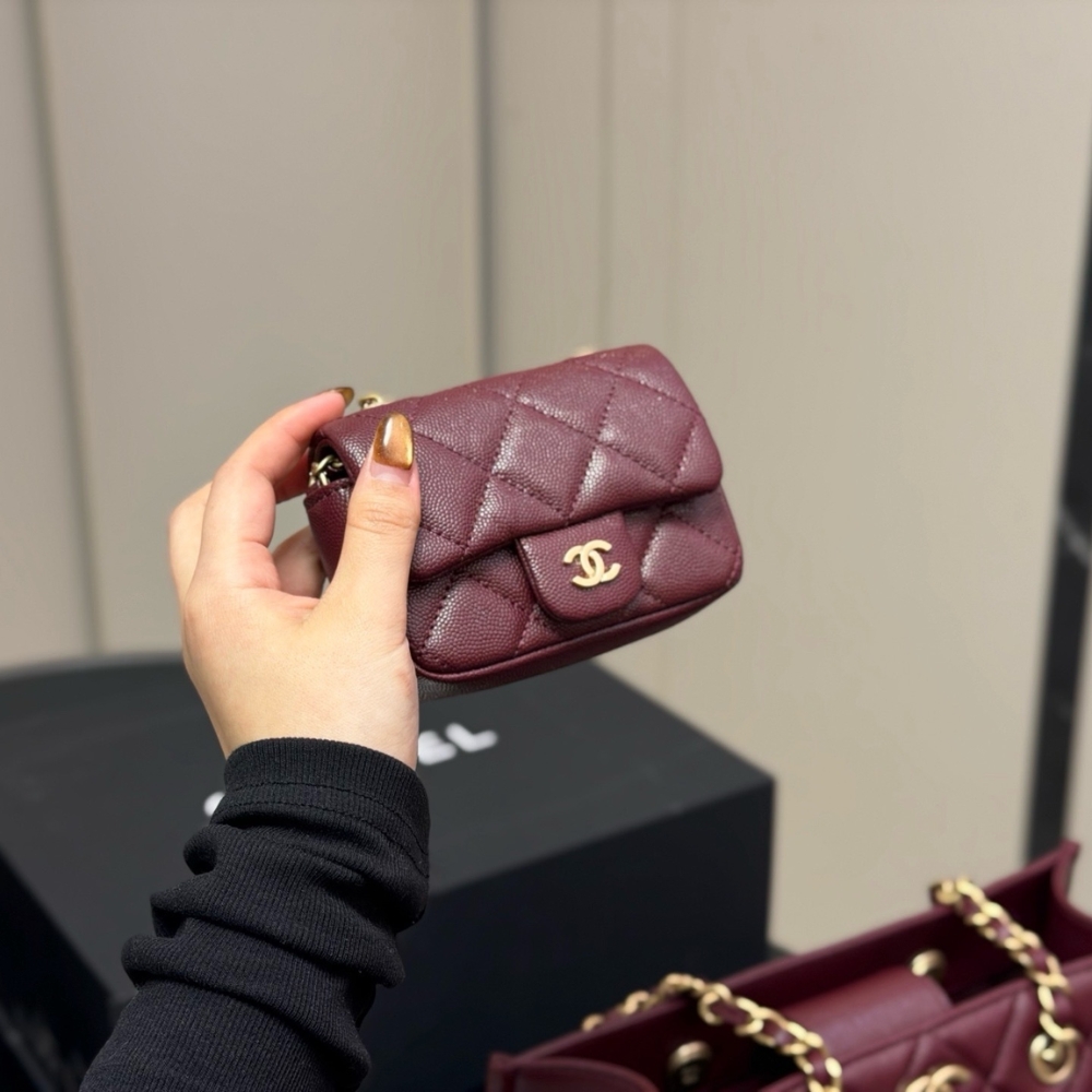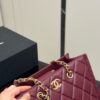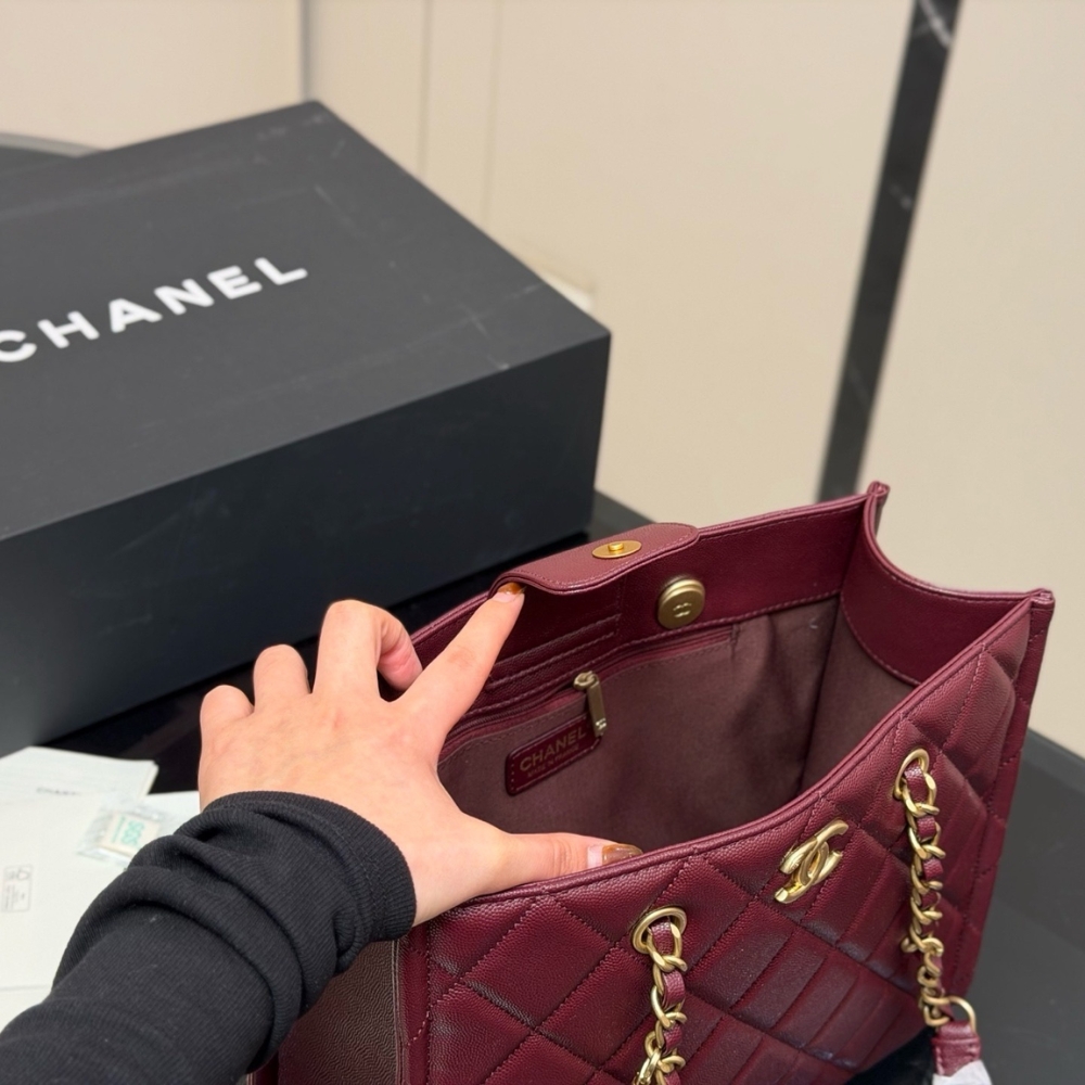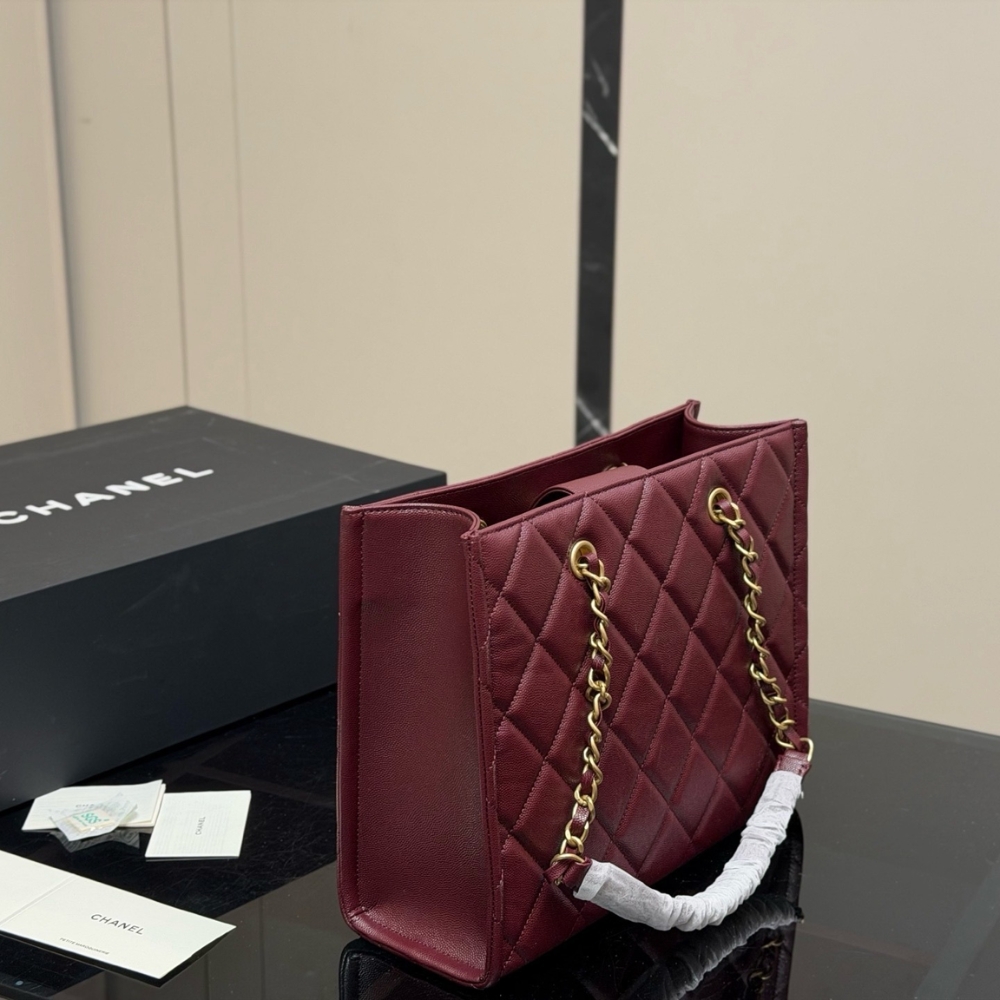 The Chanel Small Shopping Bag in Burgundy is an exquisite and practical tote that exemplifies the House’s dedication to blending daily utility with high-fashion elegance. This model is crafted from premium grained leather, offering a durable yet luxurious pebbled texture that is beautifully complemented by polished gold-tone metal hardware.