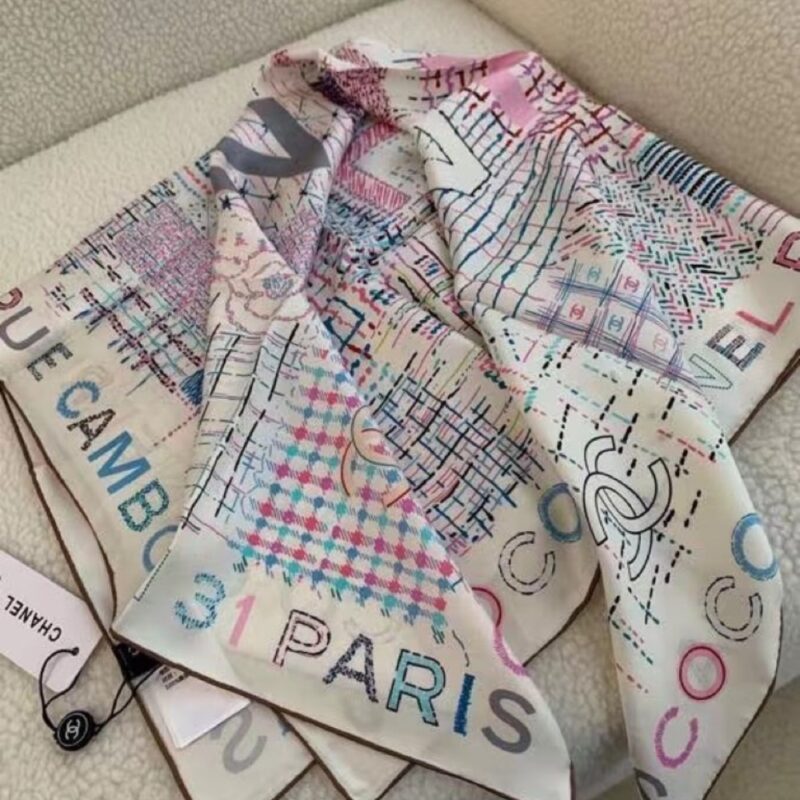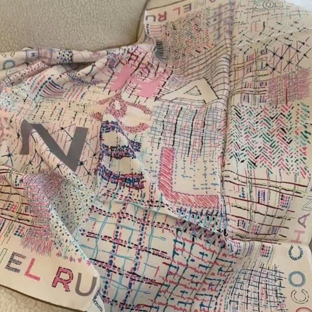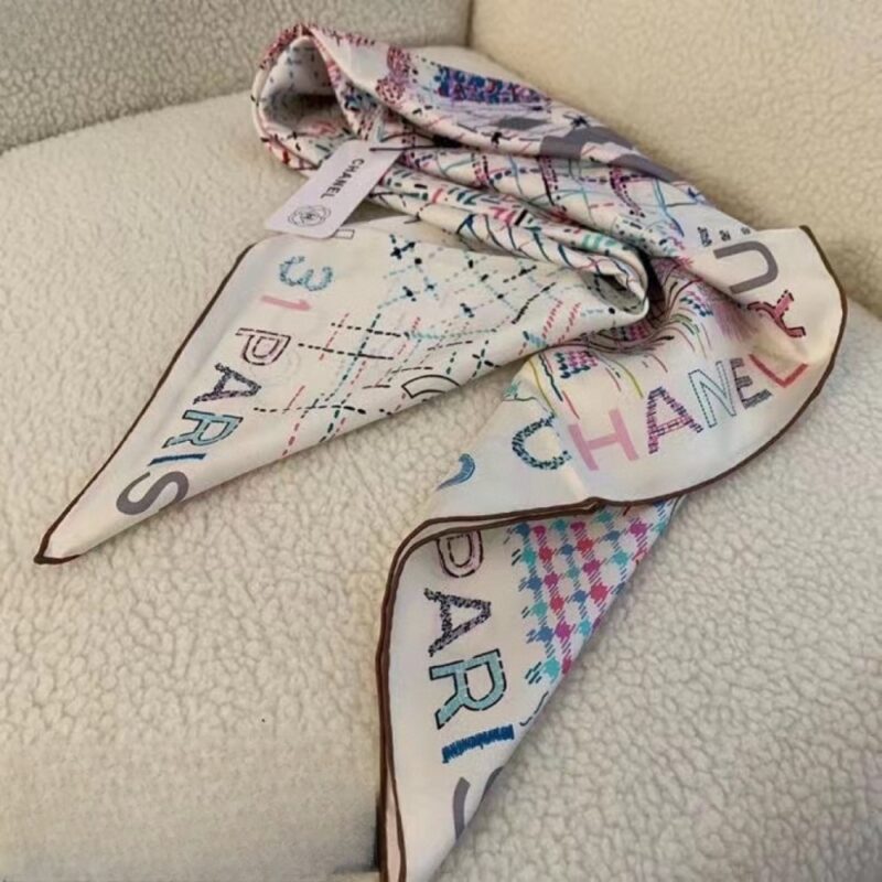 Chanel Square Scarf Silk Twill Multicolor In White 90Cm AA8619 B09320 NK635