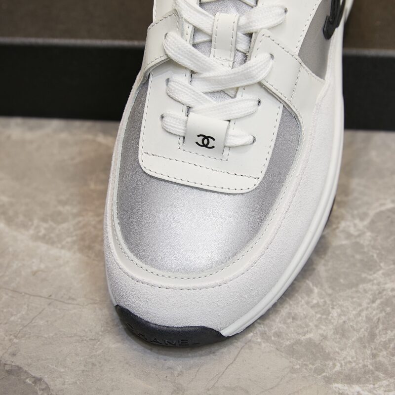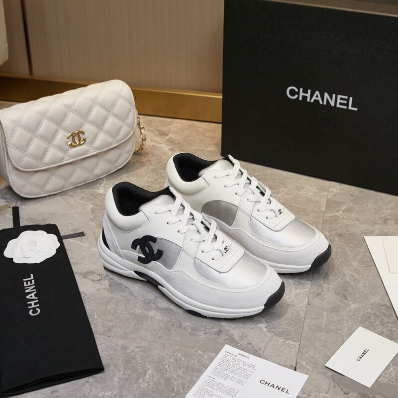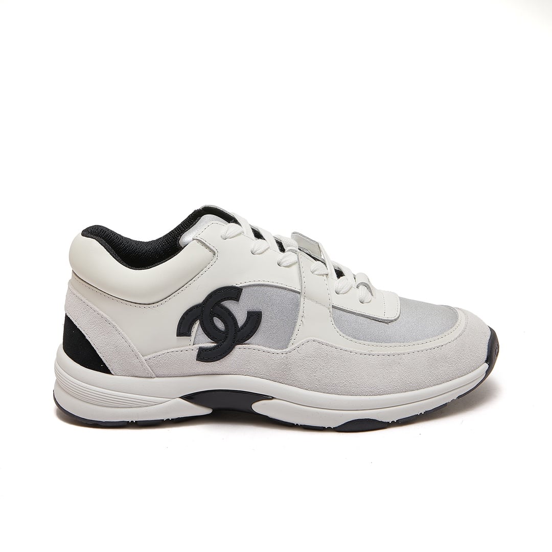 CHANEL SUEDE AND LEATHER CC LOW TOP SNEAKERS WHITE BLACK