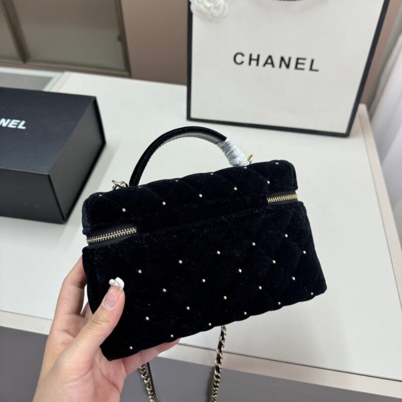 The elegance of the CHANEL Fall-Winter 2025/26 Ready-to-Wear collection is reflected in every accessory. This velvet vanity case is illuminated with strass beads and a metallic double C.