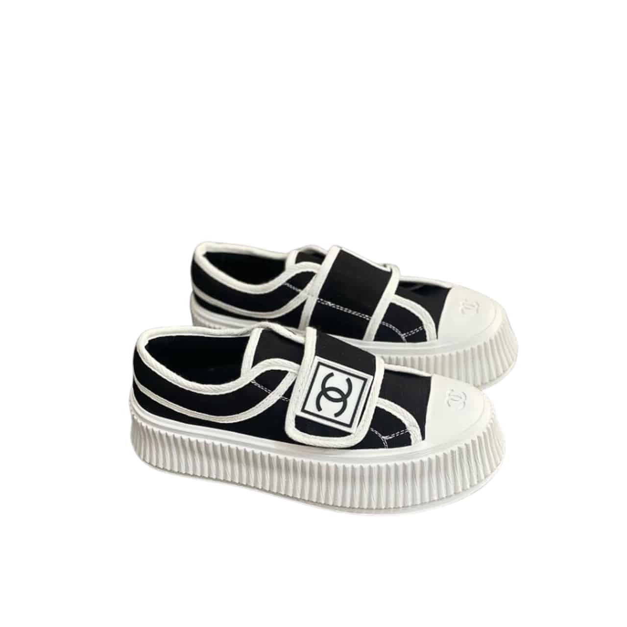 CHANEL WHITE CC CAP TOE SLIPON SNEAKER BLACK