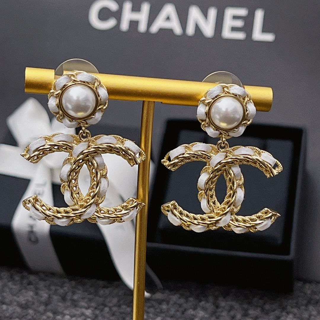 CHANEL WHITE LEATHER AND GOLD METAL EARRINGS