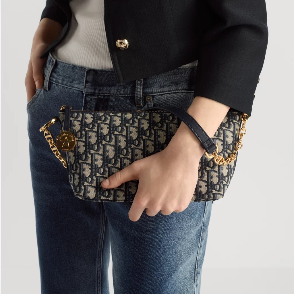 The Diorstar hobo bag with chain has a practical, modern look. Crafted in blue Dior Oblique jacquard, it features a supple silhouette and spacious compartment. Its design is enhanced by a zip closure embellished with a medallion engraved with the Christian Dior Paris signature and a star, the House’s flagship symbol, while discreet CD studs adorn the sides. The interior includes card slots, and a leather insert on the adjustable CD chain link shoulder strap allows the bag to be worn comfortably over the shoulder.