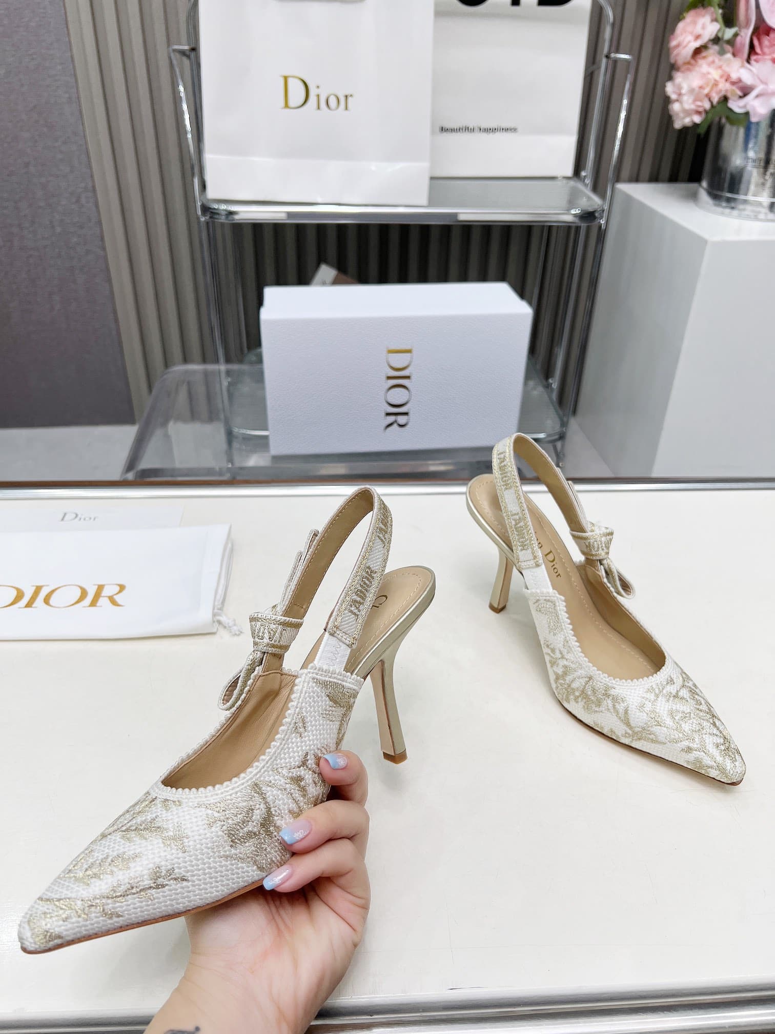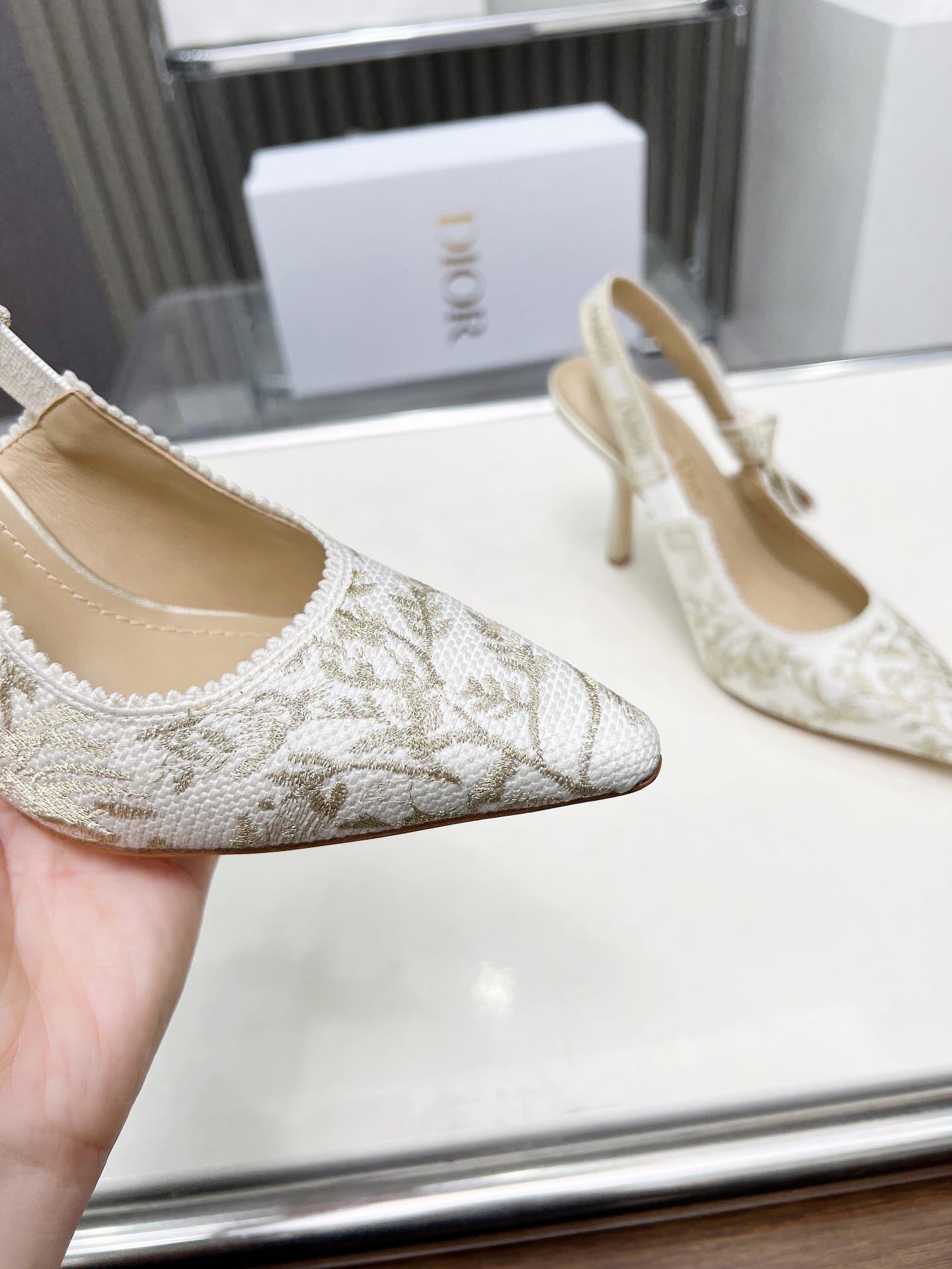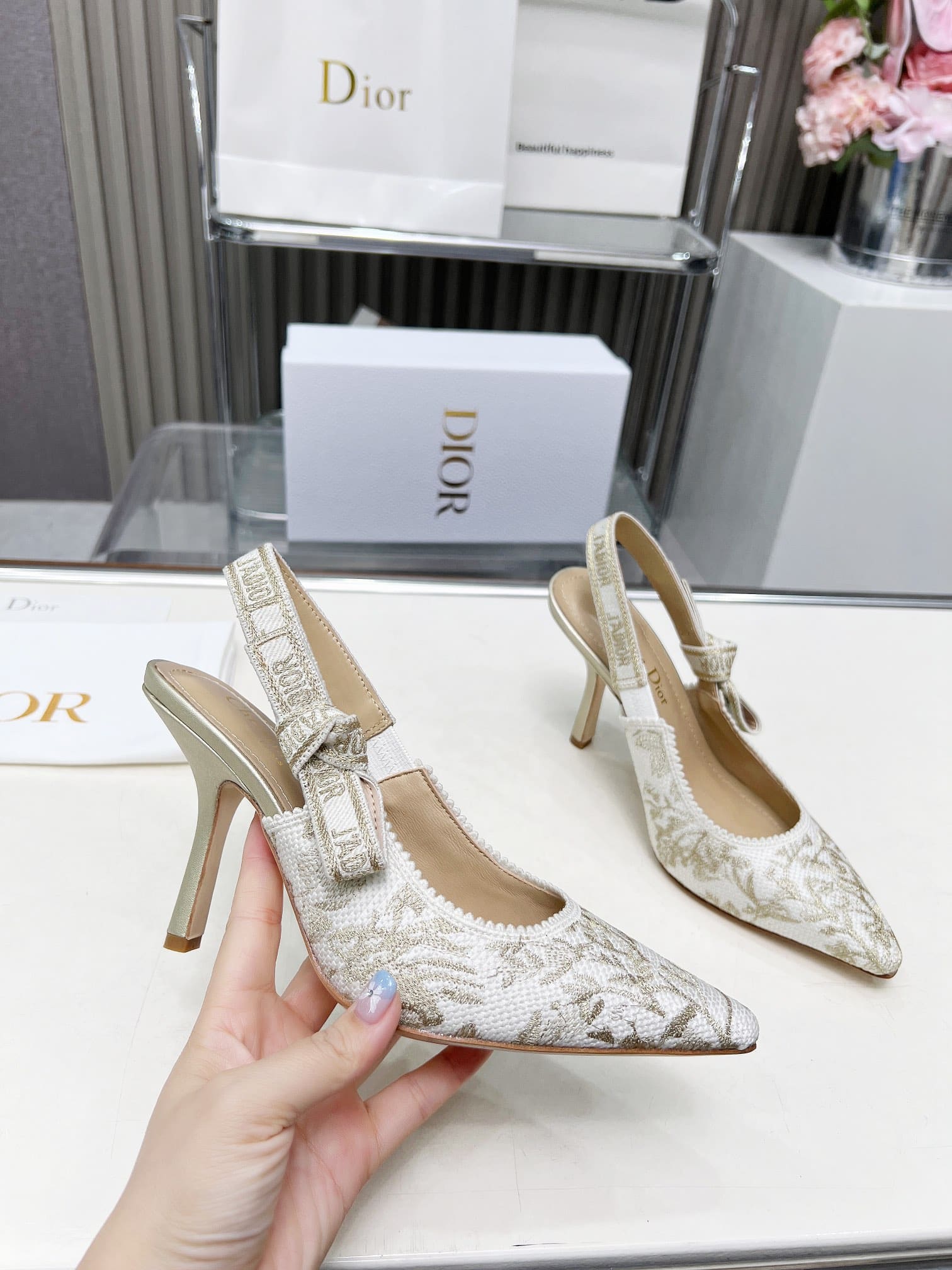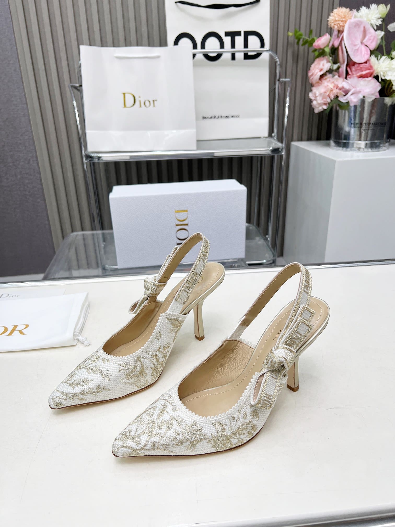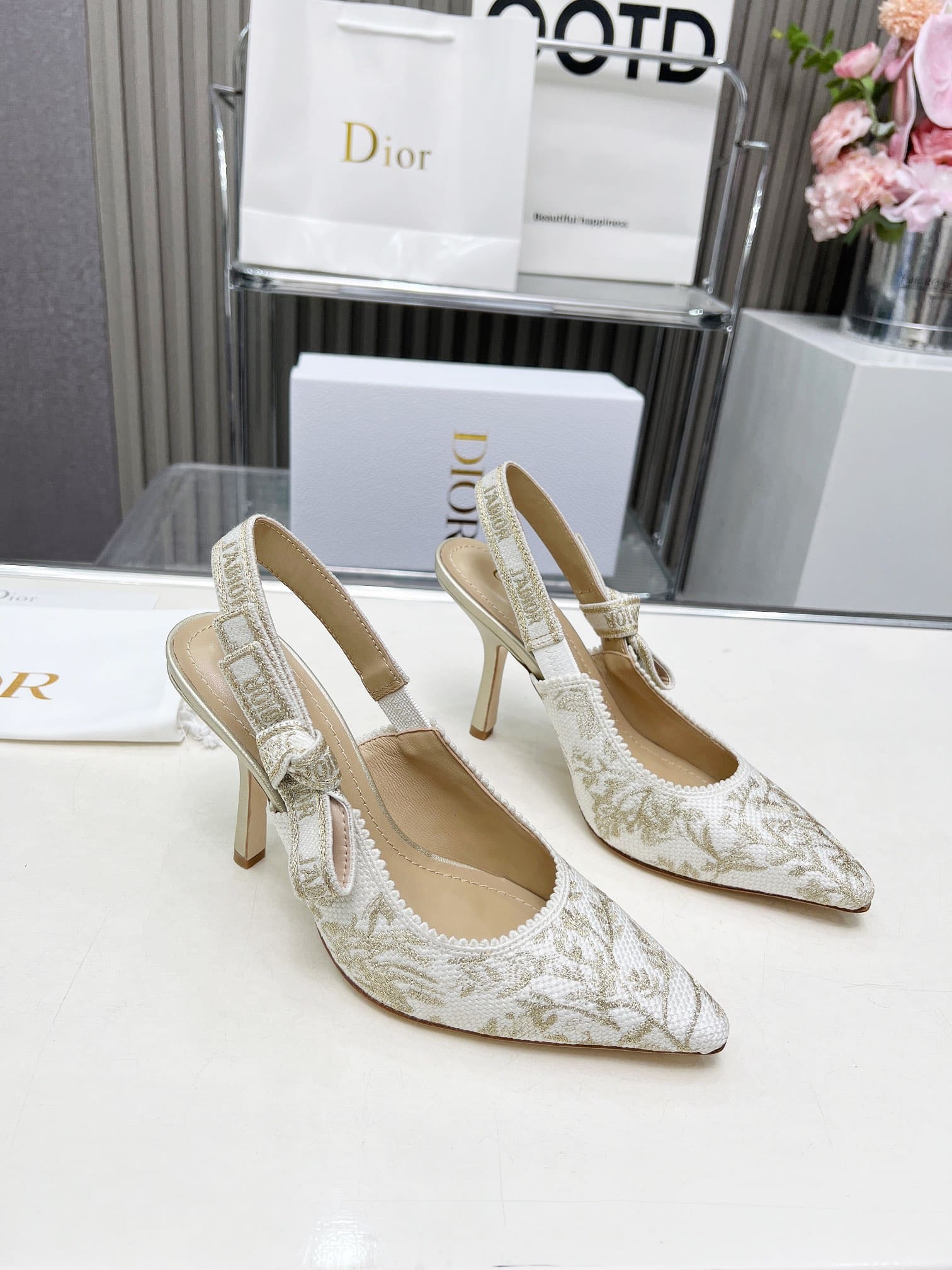DIOR J’ADIOR SLINGBACK PUMP WHITE AND GOLD TONE KDP920LJE S09W