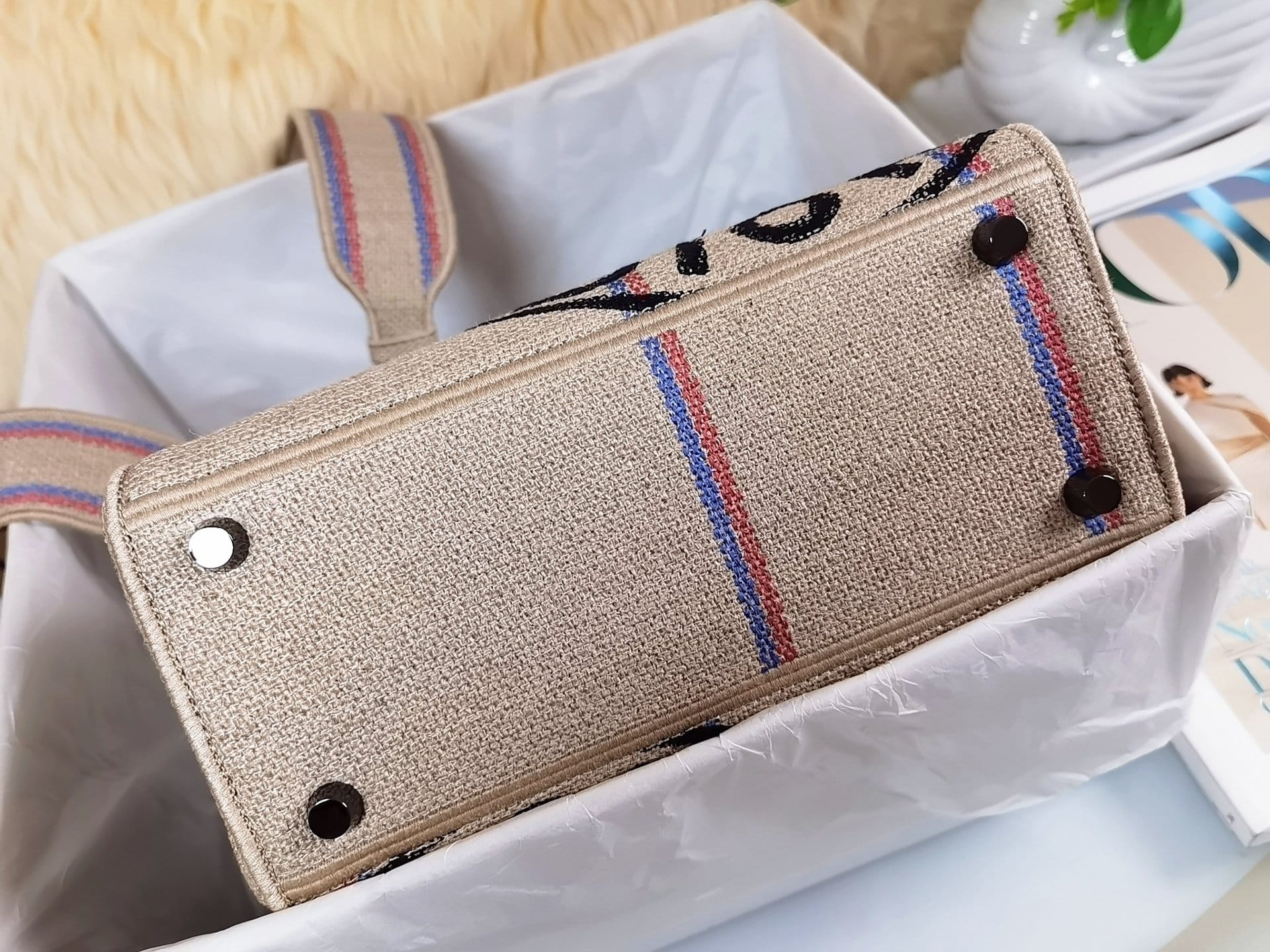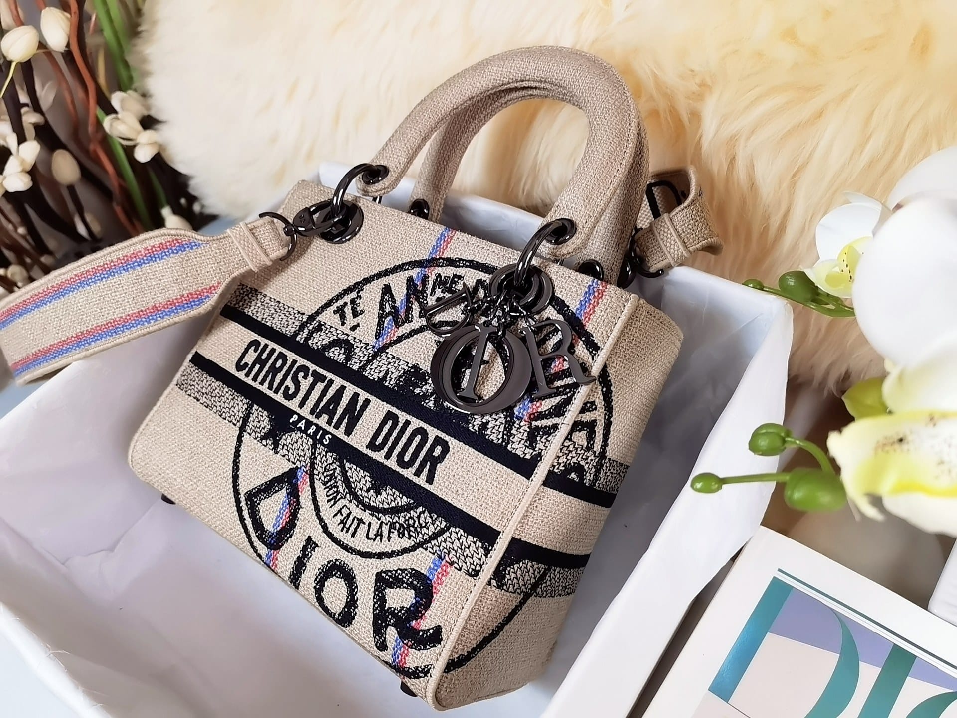DIOR MEDIUM LADY D-LITE BAG BEIGE JUTE CANVAS EMBROIDERED WITH UNION MOTIF M0565BRUW_M918 24CM
