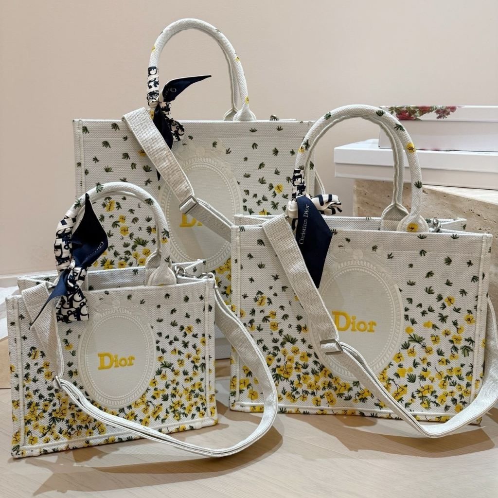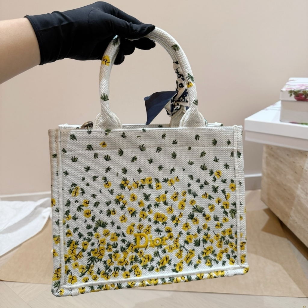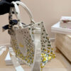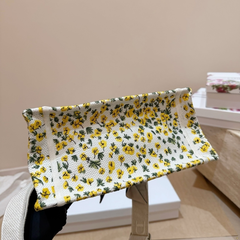 Dior Small Book Tote / Flowers Buttercup Embroidery / White and Yellow / 10.4 x 5.5 x 8.7 inches / Gold-finish metal hardware / Fits smartphone, wallet, keys, and small beauty essentials / Chic tote bag