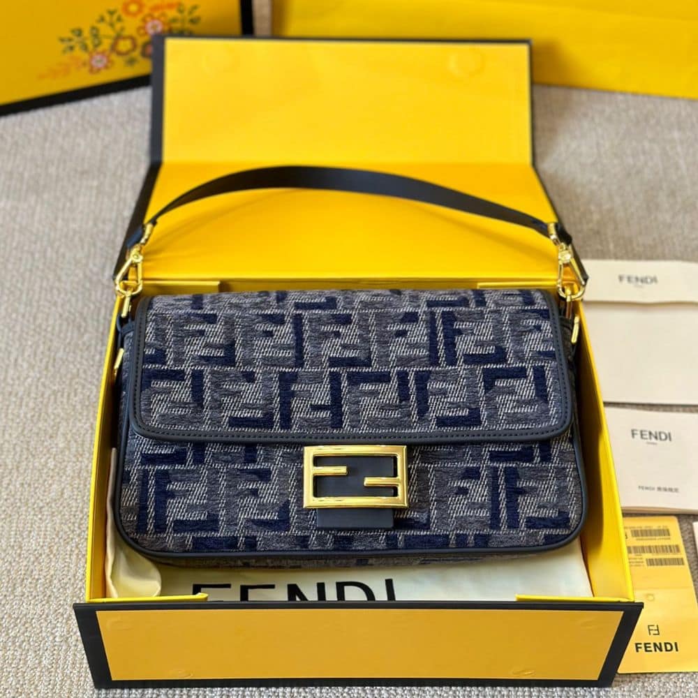 Fendi Baguette FF Chenille Bag Dark Blue 27 cm / 10.6 inches