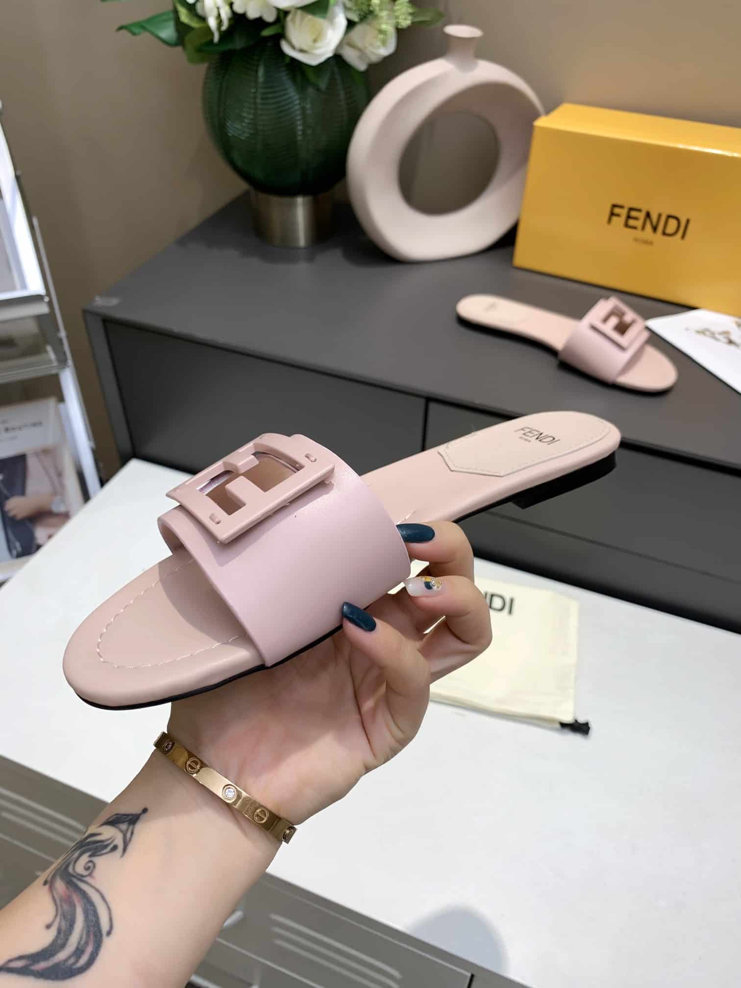 FENDI BAGUETTE LEATHER SLIDE PINK 8R8136 AE7T F1FGD