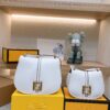 - The shoulder strap hooks become an elegant accent with studs and an FF logo when the bag is open.