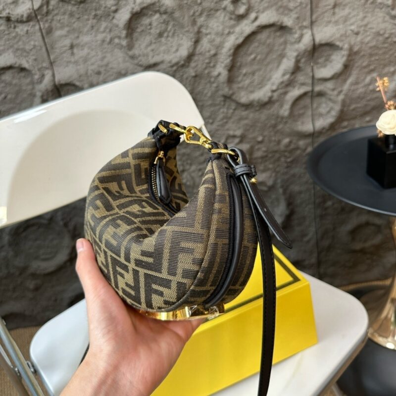 - Mini hobo bag made of brown FF jacquard motif fabric, decorated with vintage gold metal FENDI lettering.
