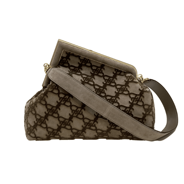 - Oversized metal F clasp wrapped in tone-on-tone suede.