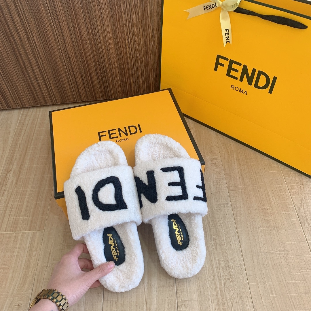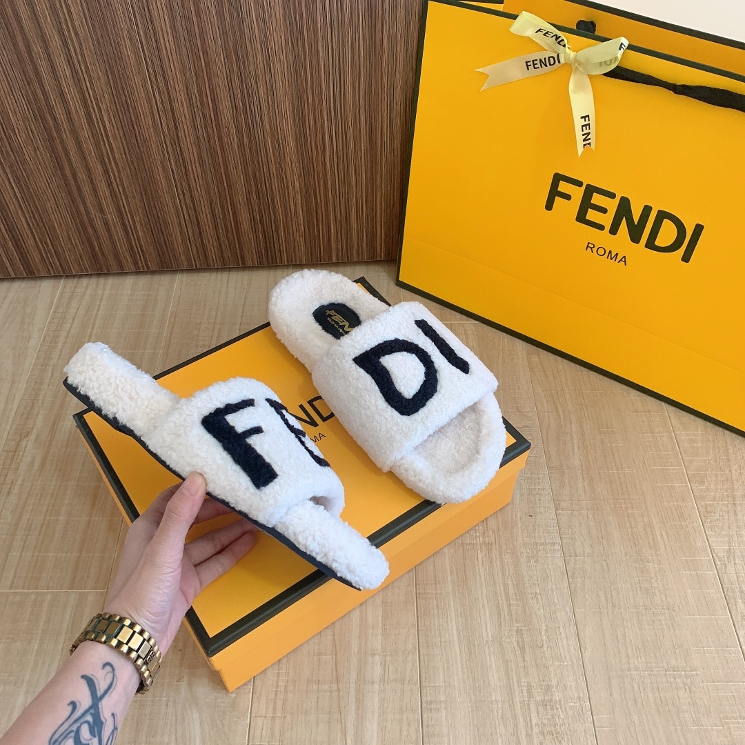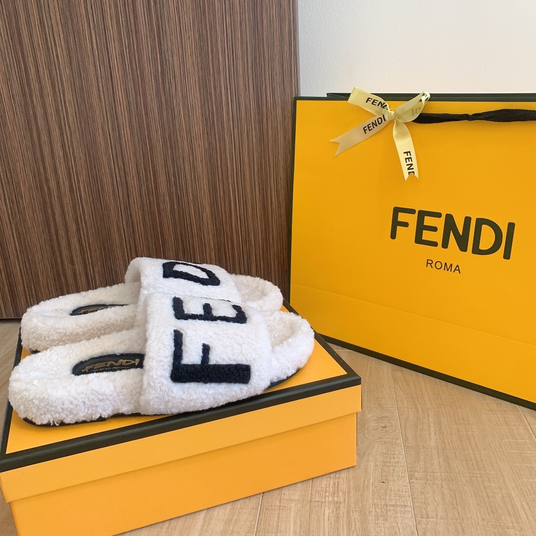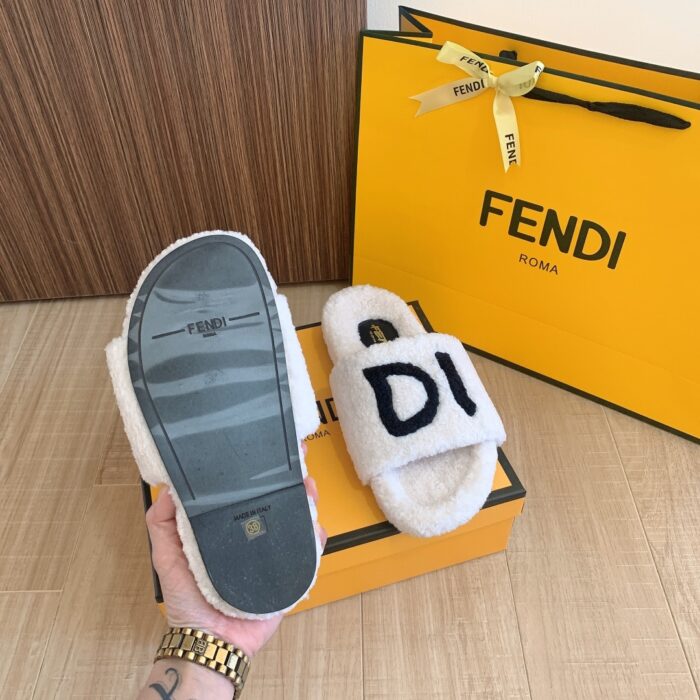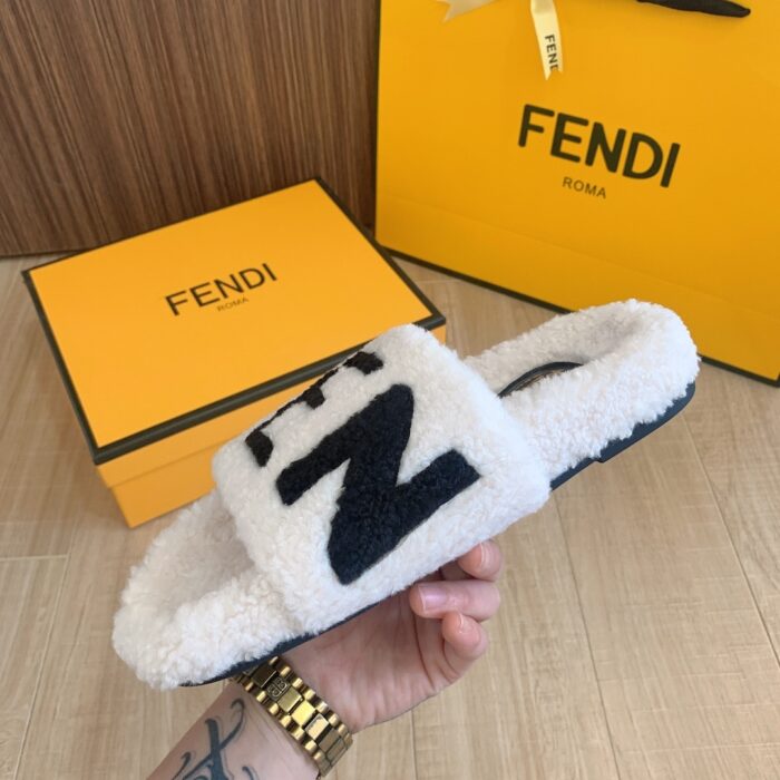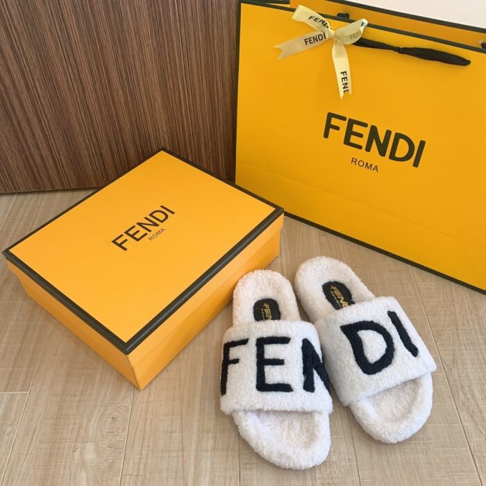 FENDI FLEECE BLACK TEXT SLIPPERS WHITE