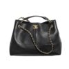 - The double removable handles: a short one in leather and one made in chain with oversized OLock logo in metal and tortoiseshell-effect plexiglass.