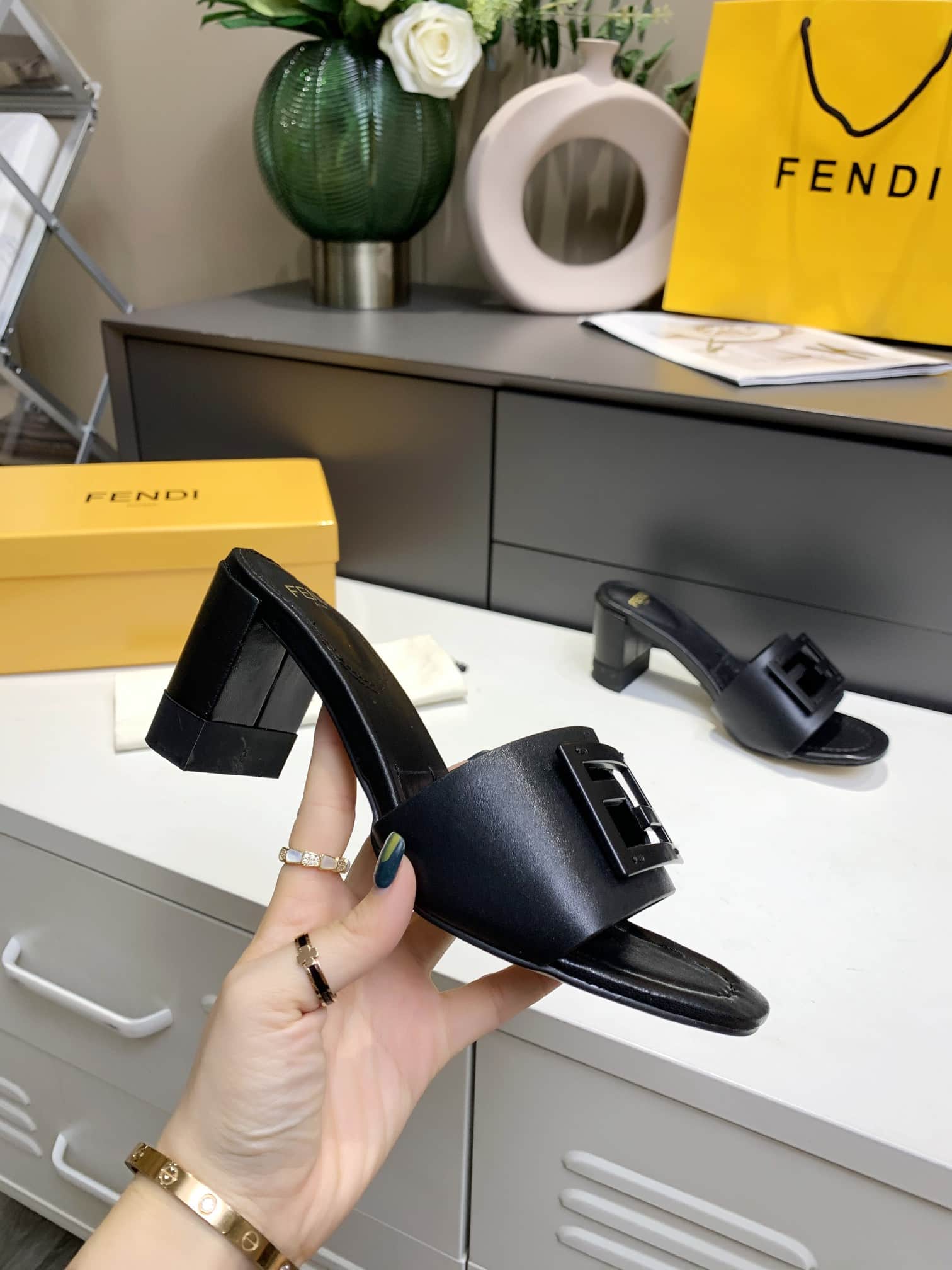 - Embellished with FF Baguette motif in tone on tone leather.