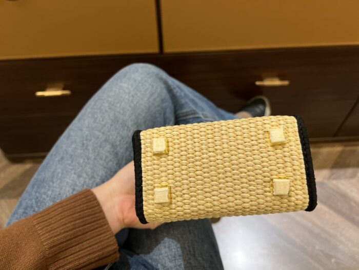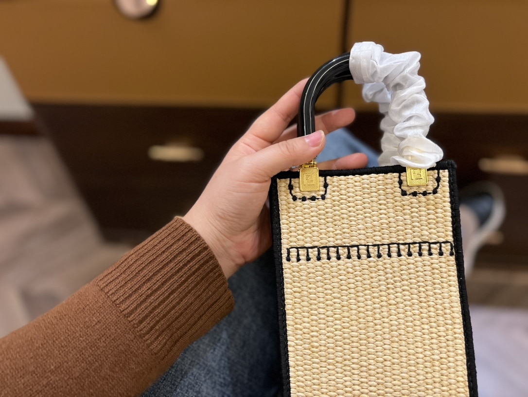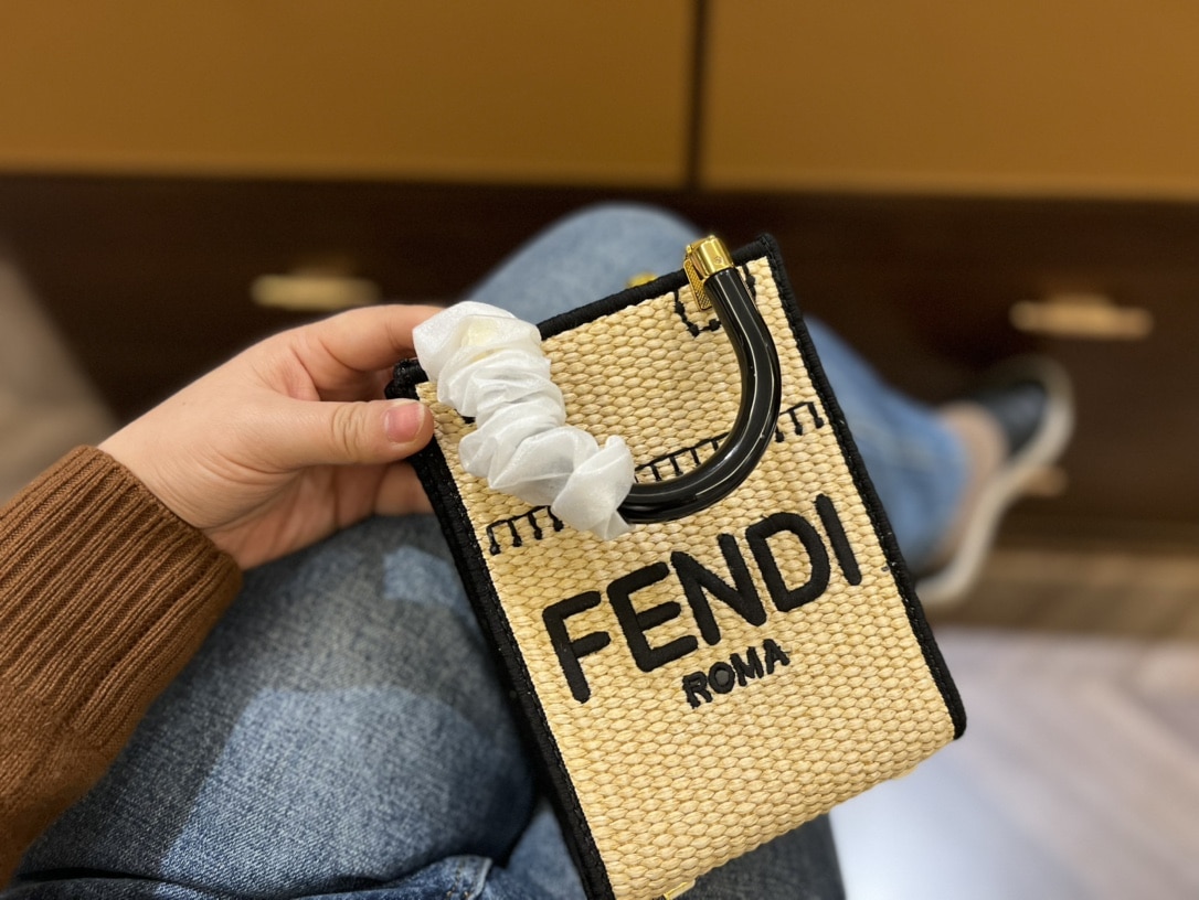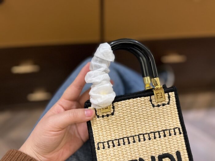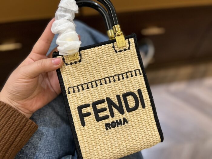 FENDI SUNSHINE MINI LEATHER-TRIMMED EMBROIDERED STRAW TOTE 19CM