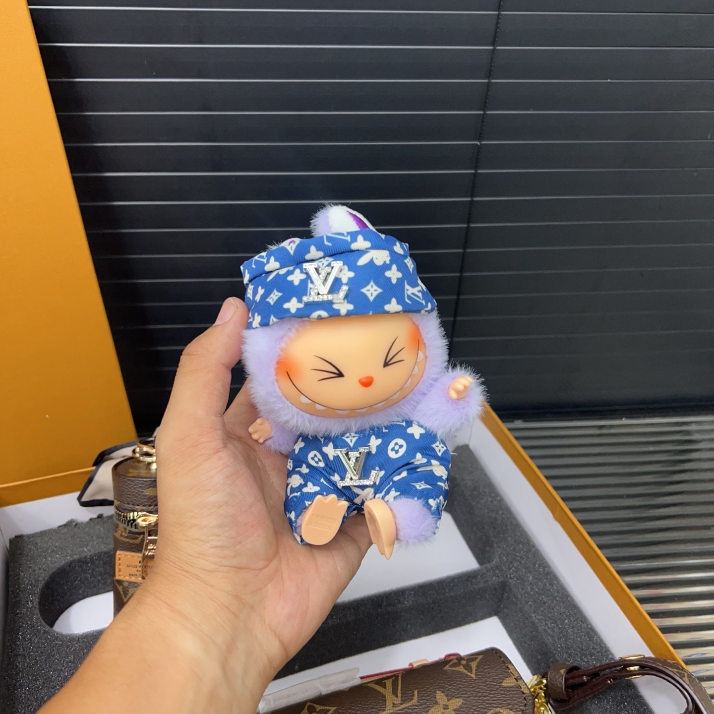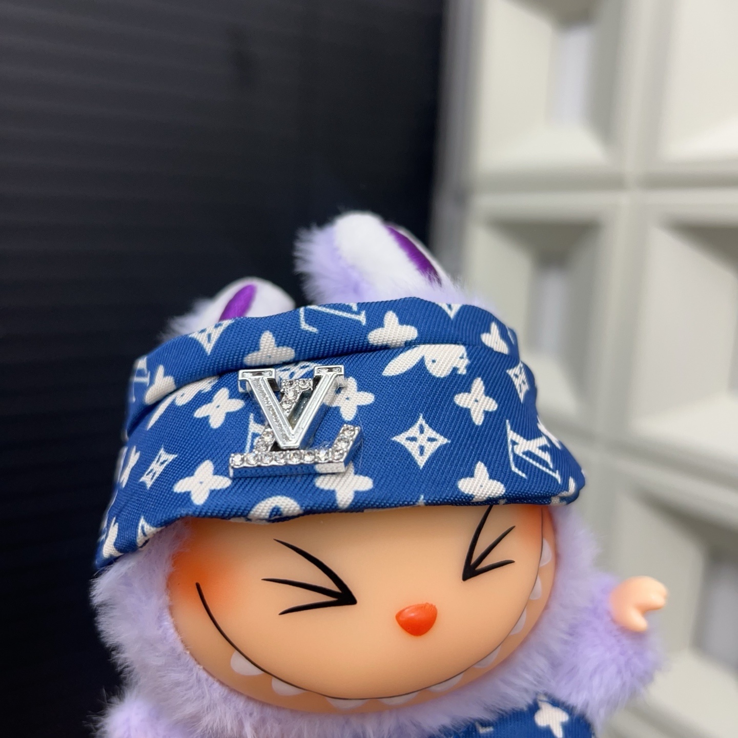 - Pop Mart Labubu doll wearing a Louis Vuitton-inspired outfit
