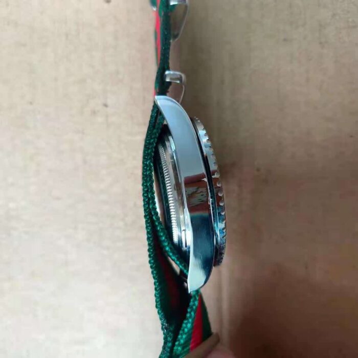 Steel case, black matte dial, green and red Web nylon strap