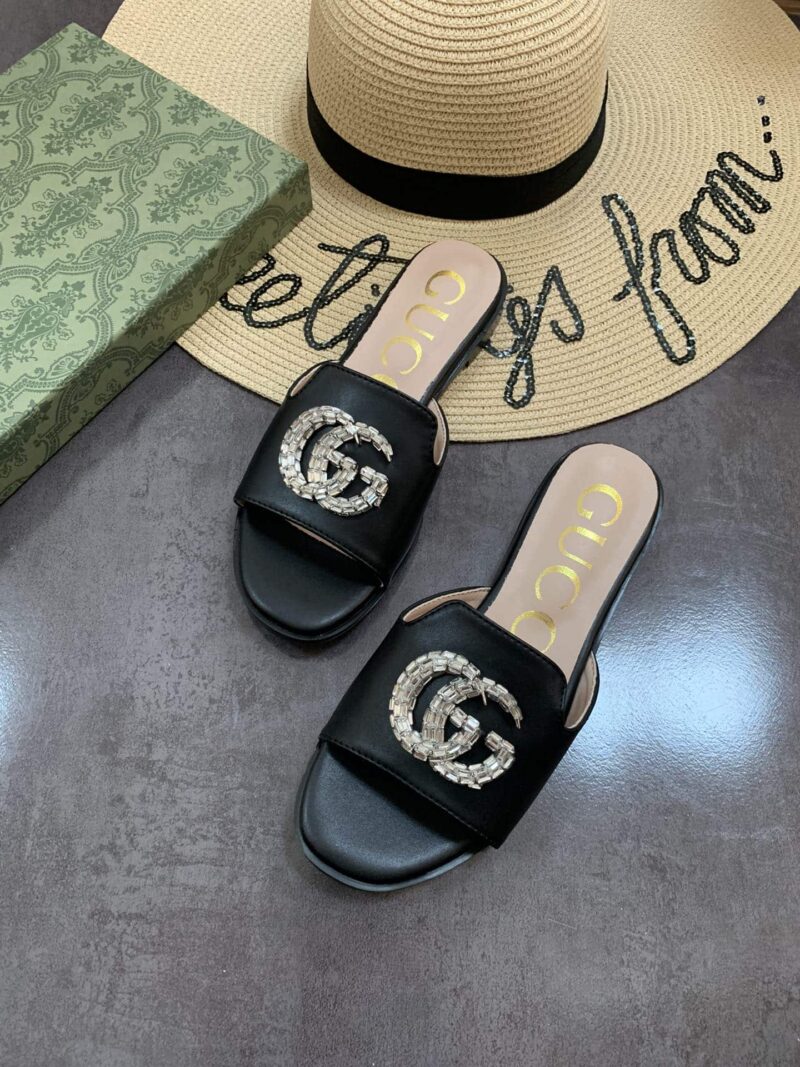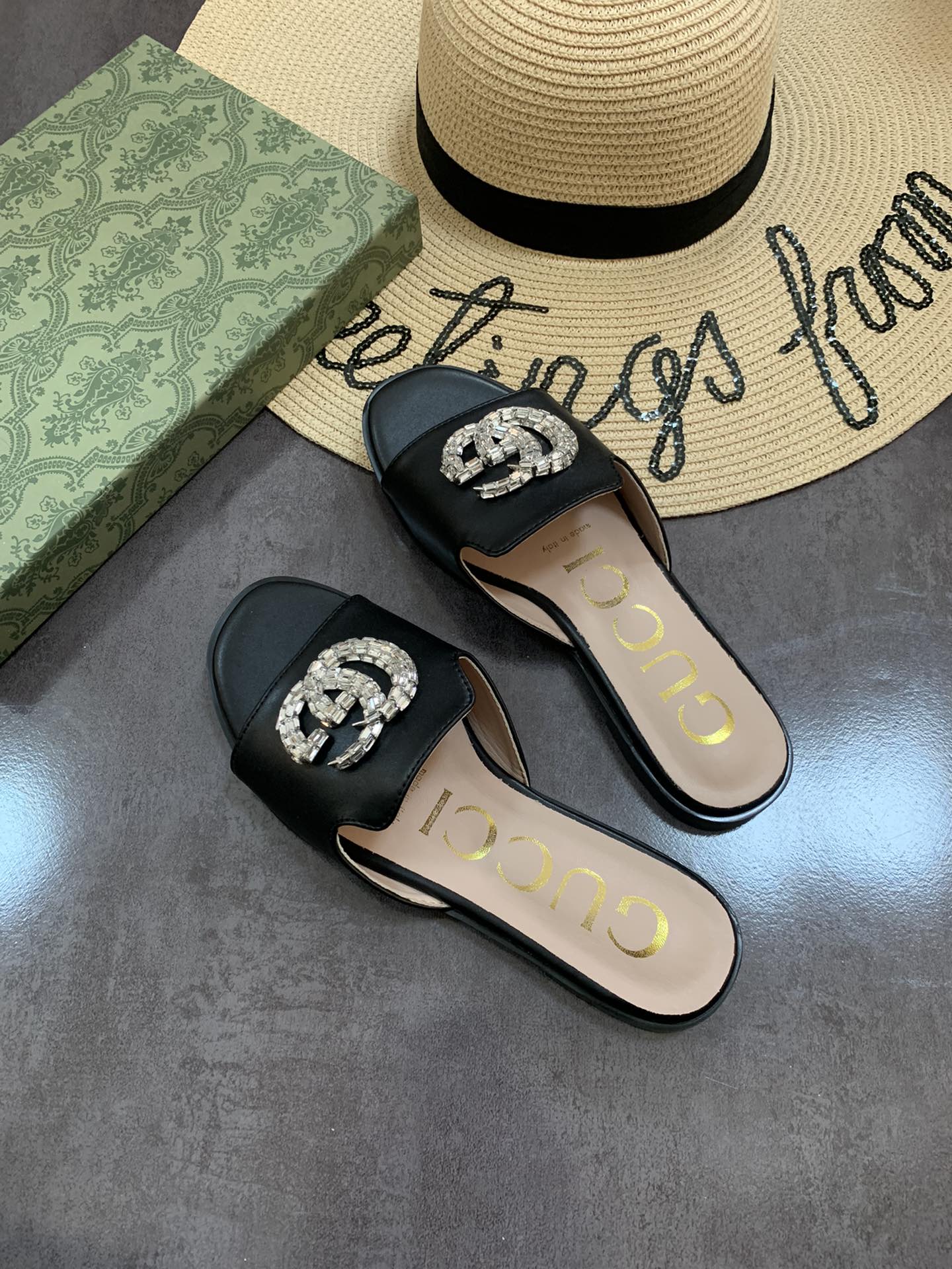 GUCCI DOUBLE G SLIPPERS LEATHER BEADED IN BLACK