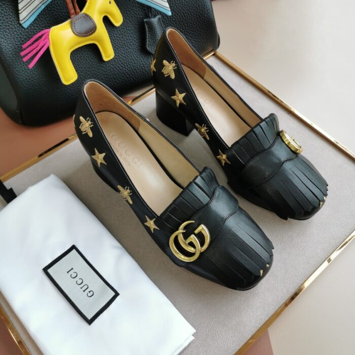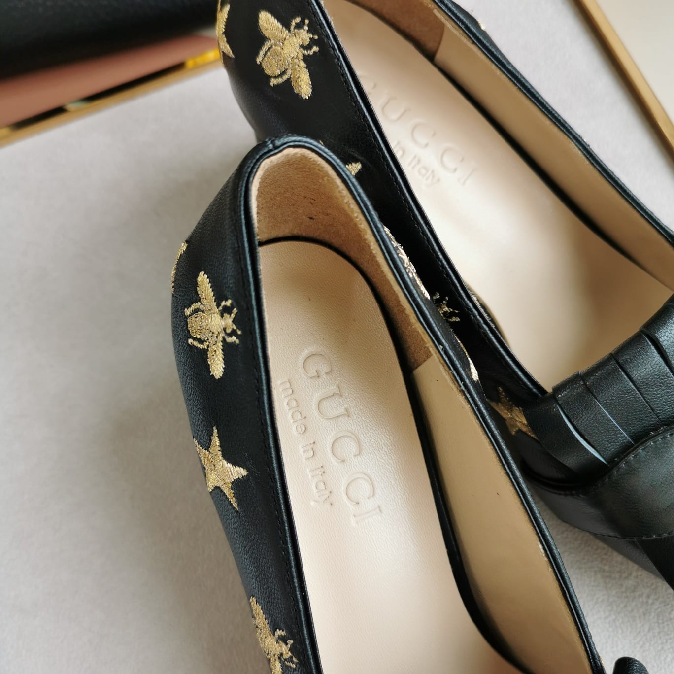 GUCCI EMBROIDERED BEE STAR LEATHER MID-HEEL PUMP BLACK