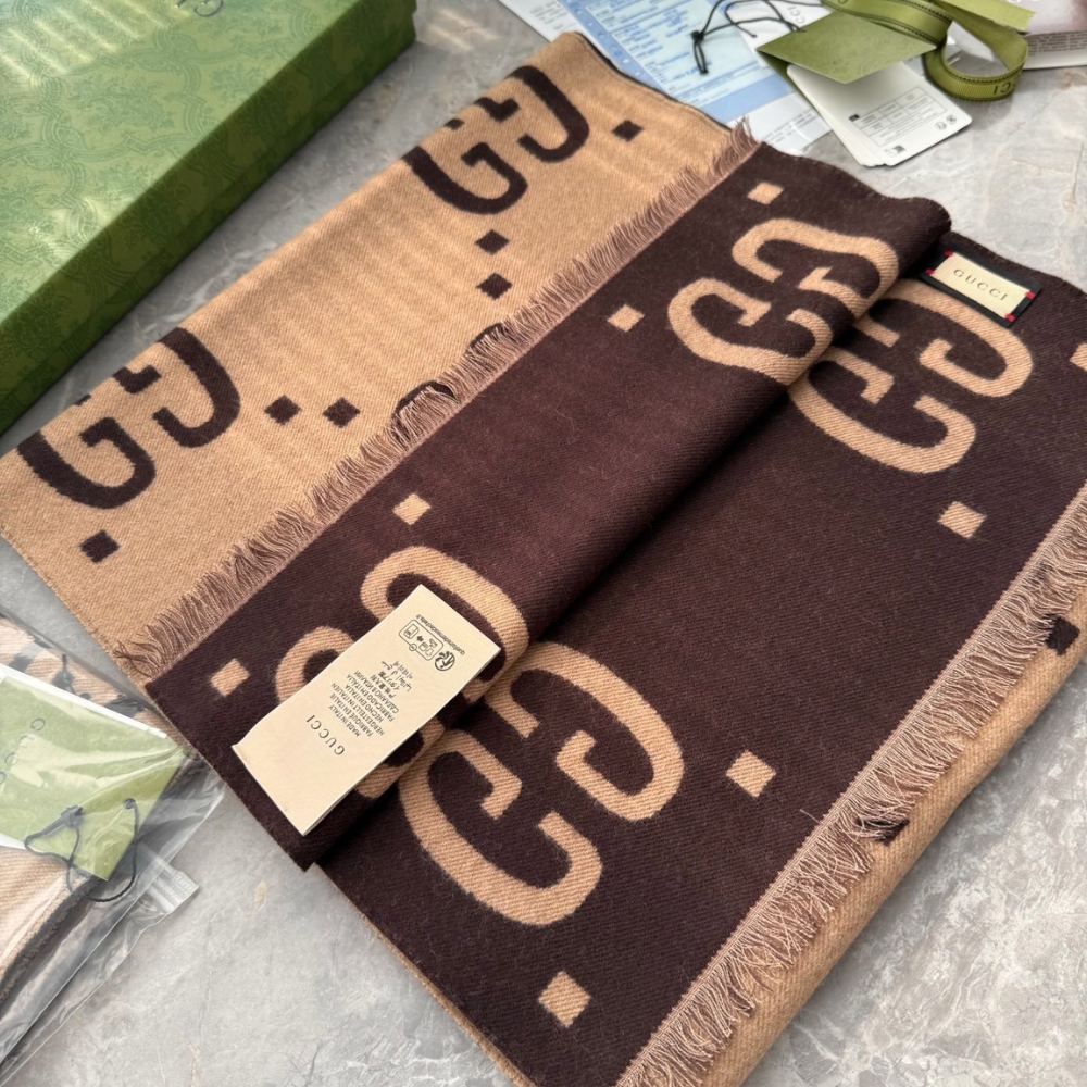 Gucci GG Jacquard Wool Silk Scarf Brown And Beige 180Cm