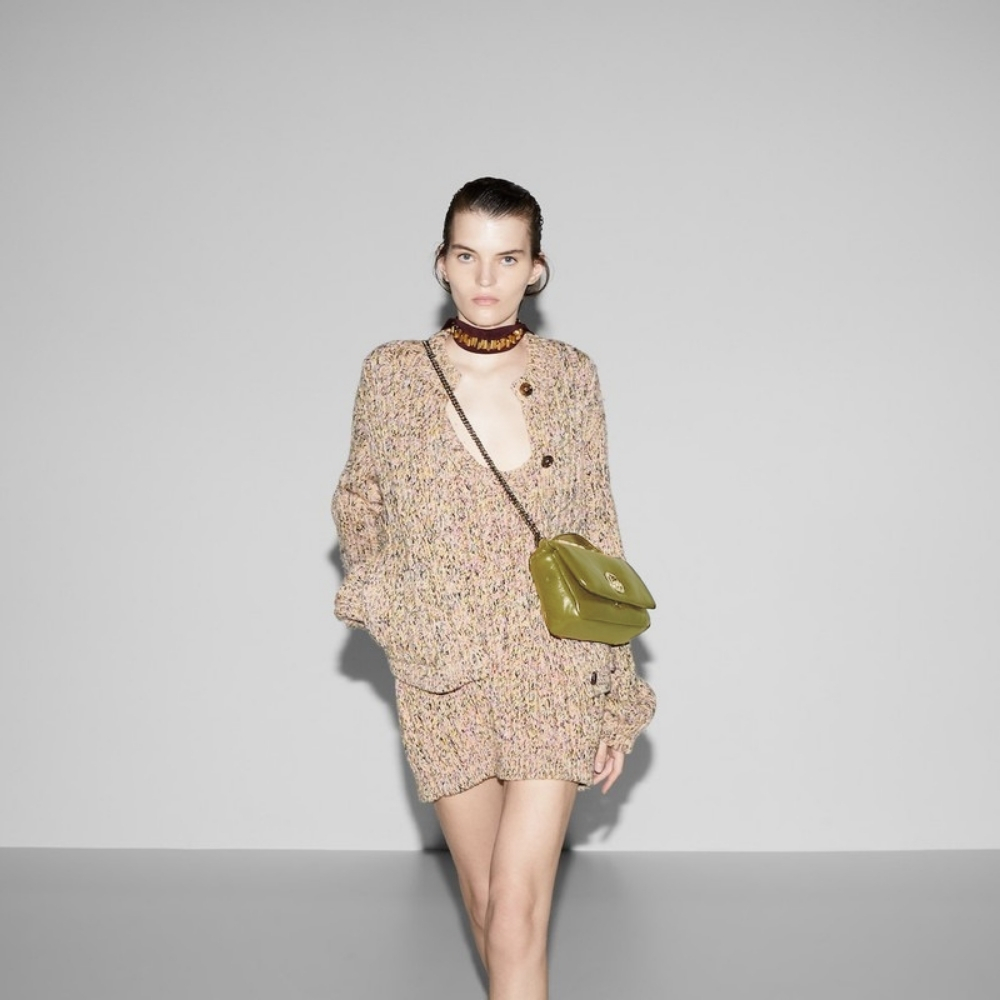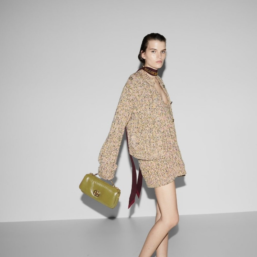 The GG Milano top handle bag by Creative Director Sabato De Sarno debuted at the Fall Winter 2024 fashion show during Milan Fashion Week, paying tribute to the city which inspired the design. It features a new Double G hardware, and the puffy leather has a soft and silky touch. The chain strap allows the bag to be worn crossybody or on the shoulder.