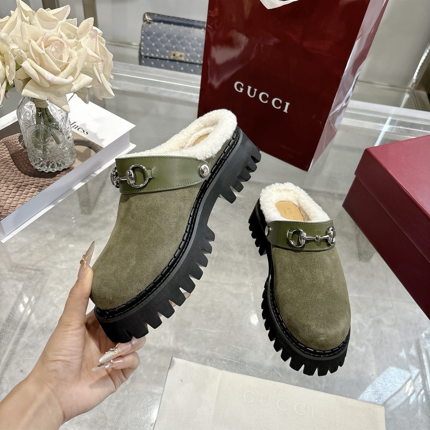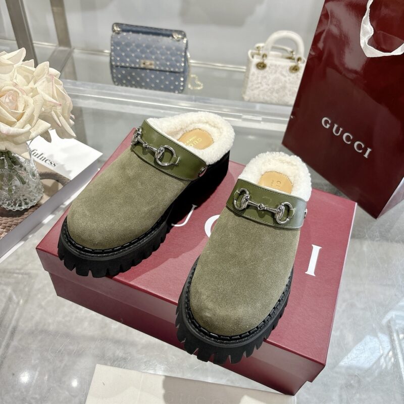 GUCCI HORSEBIT SHEARLING MULES IN DARK GREEN SUEDE